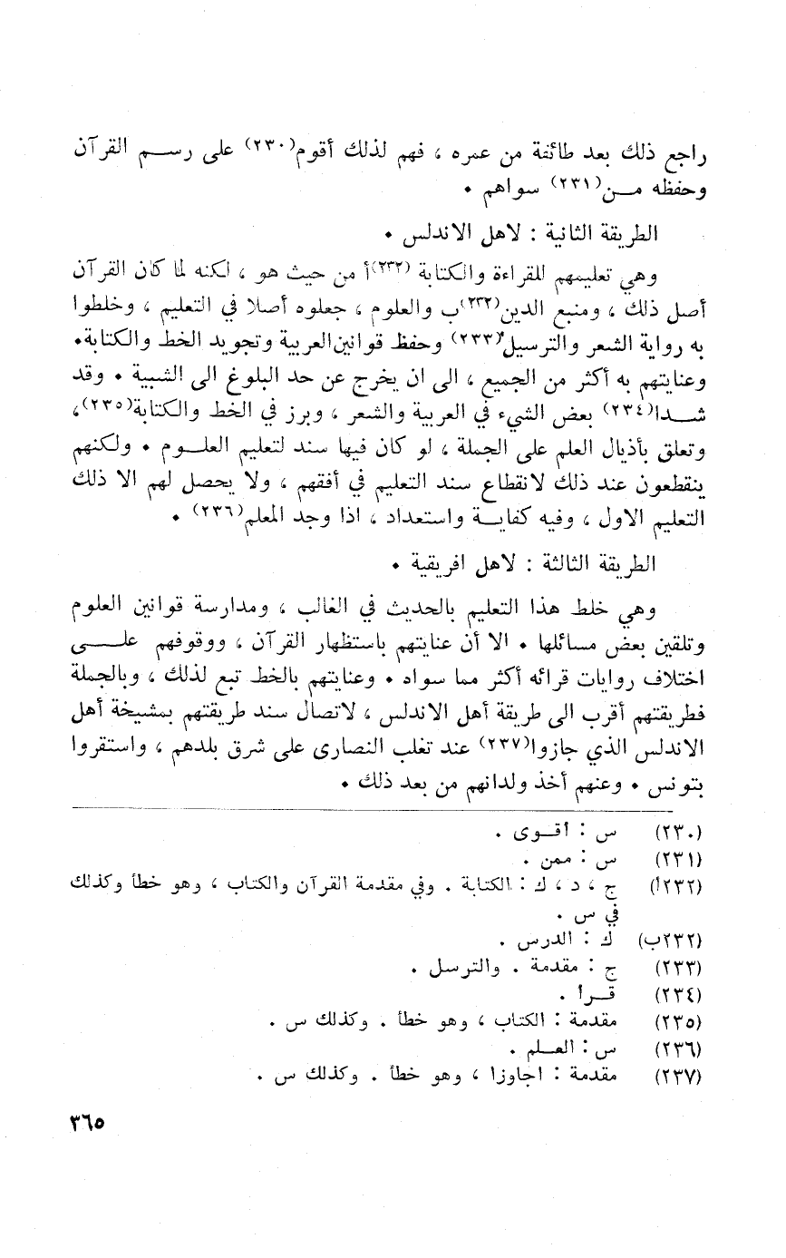 وَهِي خلط هَذَا التَّعْلِيم بِالْحَدِيثِ فِي الْغَالِب ومدارسة قوانين الْعُلُوم وتلقين بعض مسائلها إِلَّا أَن عنايتهم باستظهار الْقُرْآن ووقوفهم على اخْتِلَاف رِوَايَات قرائه اكثر مِمَّا سواهُ وعنايتهم بالخط تبع لذَلِك وَبِالْجُمْلَةِ فطريقتهم اقْربْ إِلَى طَريقَة أهل الاندلس لاتصال سَنَد طريقتهم بمشيخة أهل الاندلس الَّذِي جازوا عِنْد تغلب النَّصَارَى على شَرق بلدهم واستقروا بتونس وعنهم اخذ ولدانهم من بعد ذَلِك
