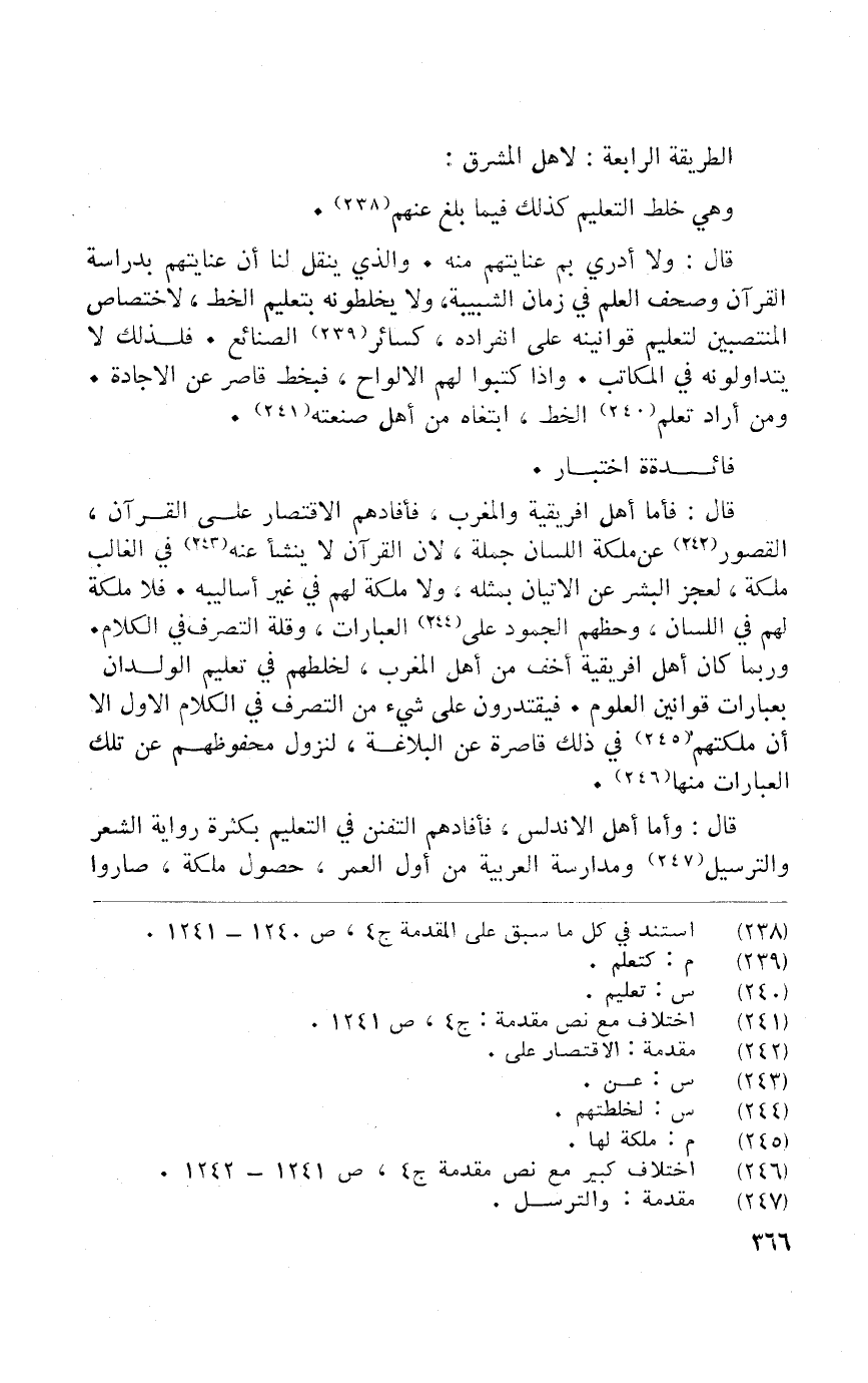 قَالَ فَأَما أهل افريقية وَالْمغْرب فأفادهم الِاقْتِصَار على الْقُرْآن الْقُصُور عَن ملكة اللِّسَان جملَة لَان الْقُرْآن لَا ينشأ عَنهُ فِي الْغَالِب ملكة لعجز الْبشر عَن الاتيان بِمثلِهِ وَلَا ملكة لَهُم فِي غير اساليبه فَلَا ملكة لَهُم فِي اللِّسَان وحظهم الجمود على الْعبارَات وَقلة التَّصَرُّف فِي الْكَلَام وَرُبمَا كَانَ أهل افريقية اخف من أهل الْمغرب لخلطهم فِي تَعْلِيم الْولدَان بعبارات قوانين الْعُلُوم فيقتدرون على شَيْء من التَّصَرُّف فِي الْكَلَام الأول إِلَّا أَن ملكتهم فِي ذَلِك قَاصِرَة عَن البلاغة لنزول محفوظهم عَن تِلْكَ الْعبارَات مِنْهَا