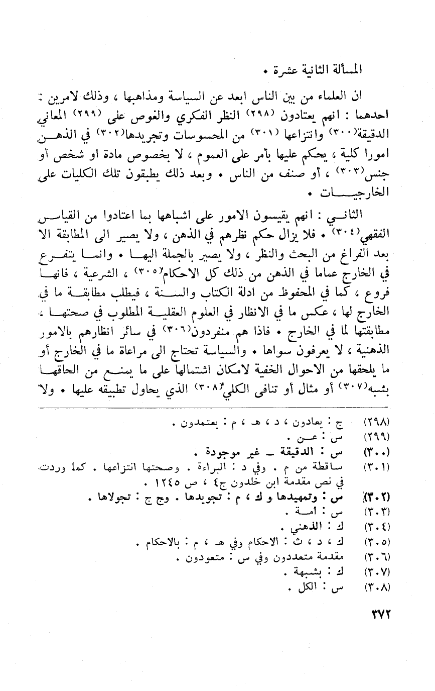 الثَّانِي انهم يقيسون الْأُمُور على اشباهها بِمَا اعتادوا من الْقيَاس الفقهي فَلَا يزَال حكم نظرهم فِي الذِّهْن وَلَا يصير إِلَى الْمُطَابقَة إِلَّا بعد الْفَرَاغ من الْبَحْث وَالنَّظَر وَلَا يصير بِالْجُمْلَةِ اليها وانما يتَفَرَّع فِي الْخَارِج عماما فِي الذِّهْن من ذَلِك كل الْأَحْكَام الشَّرْعِيَّة فَإِنَّهَا فروع كَمَا فِي الْمَحْفُوظ من أَدِلَّة الْكتاب وَالسّنة فيطلب مُطَابقَة مَا فِي الْخَارِج لَهَا عكس مَا فِي الانظار فِي الْعُلُوم الْعَقْلِيَّة الْمَطْلُوب فِي صِحَّتهَا مطابقتها لما فِي الْخَارِج فَإِذا هم منفردون فِي سَائِر انظارهم بالأمور الذهنية لَا يعْرفُونَ سواهَا والسياسة تحْتَاج إِلَى مُرَاعَاة مَا فِي الْخَارِج أَو مَا يلْحقهَا من الاحوال الْخفية لَا مَكَان اشتمالها على مَا يمْنَع من الحاقها بشبه أَو مِثَال أَو تنافى الْكُلِّي الَّذِي يحاول تطبيقه عَلَيْهَا وَلَا
