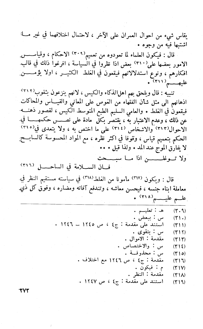 قَالَ فَيكون الْعلمَاء لما تعودوه من تَعْمِيم الْأَحْكَام وَقِيَاس الْأُمُور بَعْضهَا على بعض إِذا نظرُوا فِي السياسة افرغوما ذَلِك فِي قالب افكارهم وَنَوع استدلالاتهم فيقعون فِي الْغَلَط الْكثير اولا يُؤمن عَلَيْهِم