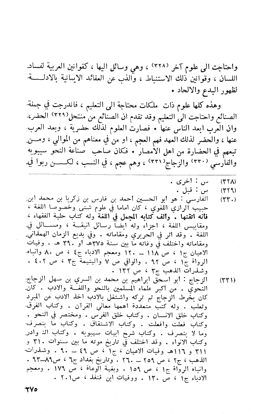 وَهَذِه كلهَا عُلُوم ذَات ملكات محتاجة إِلَى التَّعْلِيم فاندرجت فِي جملَة الصَّنَائِع واحتاجت إِلَى التَّعْلِيم وَقد تقدم أَن الصَّنَائِع من منتحل الْحَضَر وان الْعَرَب ابعد النَّاس عَنْهَا فَصَارَت الْعُلُوم لذَلِك حضرية وَبعد الْعَرَب عَنْهَا والحضر لذَلِك الْعَهْد فهم الْعَجم أَو من فِي معناهم من الموَالِي وَمن تَبِعَهُمْ فِي الحضارة من أهل الامصار فَكَانَ صَاحب صناعَة النَّحْو سِيبَوَيْهٍ والفارسي والزجاج وهم عجم فِي النّسَب لَكِن ربوا فِي