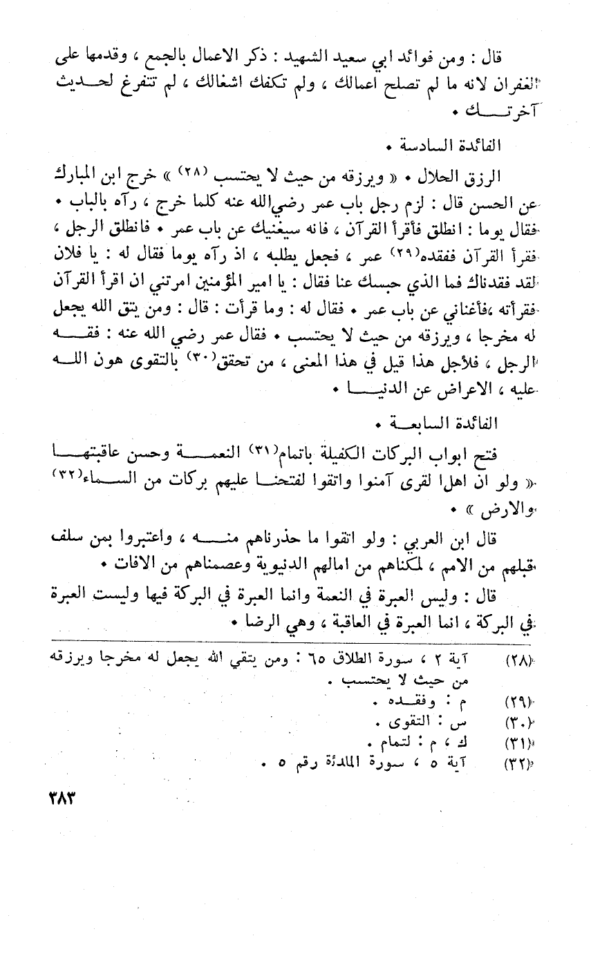 الرزق الْحَلَال {وَيَرْزقهُ من حَيْثُ لَا يحْتَسب} خرج ابْن الْمُبَارك عَن الْحسن قَالَ لزم رجل بَاب عمر رَضِي الله عخنه كلما خرج رَآهُ بِالْبَابِ فَقَالَ يَوْمًا انْطلق فأقرأ الْقُرْآن فَإِنَّهُ سيغنيك عَن بَاب عمر فَانْطَلق الرجل فَقَرَأَ الْقُرْآن فَفَقدهُ عمر فَجعل يَطْلُبهُ إِذْ رَآهُ يَوْمًا فَقَالَ لَهُ يَا فلَان لقد فقدناك فَمَا الَّذِي حَبسك عَنَّا فَقَالَ يَا أَمِير الْمُؤمنِينَ أَمرتنِي أَن اقْرَأ الْقُرْآن فَقَرَأته فإنني عَن بَاب عمر فَقَالَ لَهُ وَمَا قَرَأت قَالَ {وَمن يتق الله يَجْعَل لَهُ مخرجا وَيَرْزقهُ من حَيْثُ لَا يحْتَسب} فَقَالَ عمر رَضِي الله عَنهُ فقه الرجل فلأجل هَذَا قيل فِي هَذَا الْمَعْنى من تحقق بالتقوى هون الله عَلَيْهِ الاعراض عَن الدُّنْيَا