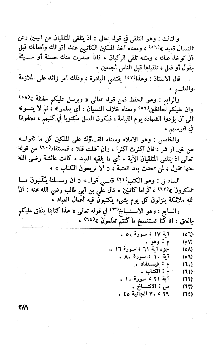 وَالثَّالِث وَهُوَ التلقي فِي قَوْله تَعَالَى {إِذْ يتلَقَّى المتلقيان عَن الْيَمين وَعَن الشمَال قعيد} وَمَعْنَاهَا أَخذ الْملكَيْنِ الْكَاتِبين عَنْك اقوالك وافعالك قبل أَن توخذ عَنْك وَمثله تلقي الركْبَان فَإِذا صدرت مِنْك حَسَنَة أَو سَيِّئَة بقوله أَو فعل تلقياها قبل النَّاس أَجْمَعِينَ