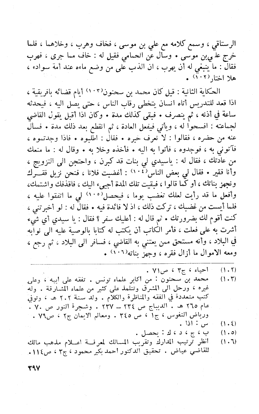 الْحِكَايَة الثَّانِيَة قيل كَانَ مُحَمَّد بن سَحْنُون ايام قَضَائِهِ بأفريقية إِذا قعد للتدريس أَتَاهُ انسان يتخطى رِقَاب النَّاس حَتَّى يصل اليه فيحدثه سَاعَة فِي أُذُنه ثمَّ ينْصَرف فبقى كَذَلِك مُدَّة وَكَانَ إِذا اقبل يَقُول القَاضِي لجماعته افسحوا لَهُ وَيَأْتِي فيفعل الْعَادة ثمَّ انْقَطع بعد ذَلِك مُدَّة فَسَأَلَ عَنهُ من حَضَره فقاولوا لَا عرف خَبره فَقَالَ اطلبوه فَإِذا وجدتموه فآتوني بِهِ فوجدوه فَأتوا بِهِ اليه فَأَخذه وخلا بِهِ وَقَالَ لَهُ مَا مَنعك من عادتك فَقَالَ لَهُ يَا سَيِّدي لي بَنَات قد كبرن واحتجن إِلَى التَّزْوِيج وَأَنا فَقير فَقَالَ لي بعض النَّاس أغضبت فلَانا فَنحْن نزيل فقرك ونجهز بناتك أَو كَمَا قَالُوا فَبَقيت تِلْكَ الْمدَّة أجيء اليك فاقذفك واشتمك وأفعل مَا قدر رَأَيْت علك تغْضب يَوْمًا فَيحصل لي مَا اتَّفقُوا عَلَيْهِ فَلَمَّا أَيِست من غضبك تركت ذَلِك إِذْ لَا فَائِدَة فِيهِ فَقَالَ لَهُ لَو اخبرتني كنت اقوم لَك بضرورتك ثمَّ قَالَ لَهُ اعليك سفر فَقَالَ لَهُ لَو اخبرتني كنت اقوم لَك بضرورتك ثمَّ قَالَ لَهُ اعليك سفر فَقَالَ يَا سَيِّدي أَي شَيْء اشرت بِهِ على فعلت فَأمر الْكَاتِب أَن يكْتب لَهُ كتابا بِالْوَصِيَّةِ عَلَيْهِ إِلَى نوابه فِي الْبِلَاد وانه مُسْتَحقّ مِمَّن يعتني بِهِ القَاضِي فسافر إِلَى الْبِلَاد ثمَّ رَجَعَ وَمَعَهُ الْأَمْوَال مَا أَزَال فقره وجهز بَنَاته
