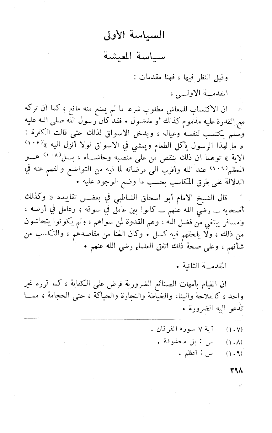 قَالَ الشَّيْخ الْأَمَام أَبُو اسحاق الشاطبي فِي بعض تقاييده وَكَذَلِكَ اصحابه رَضِي الله عَنْهُم كَانُوا بَين عَامل فِي سوقه وعامل فِي أرضه ومسافر يَبْتَغِي من فضل الله وهم الْقدْوَة لمن سوماهم وَلم يَكُونُوا يتحاشون من ذَلِك وَلَا يلحقهم فِيهِ كسل وَكَانَ الْغِنَا من مقاصدهم والتكسب من شَأْنهمْ وعَلى صِحَة ذَلِك اتّفق الْعلمَاء رَضِي الله عَنْهُم