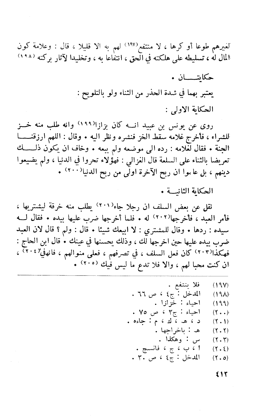 نقل عَن بعض السّلف أَن رجلا جَاءَ يطْلب مِنْهُ خرقَة ليشتريها فَأمر العَبْد فأخرجها لَهُ فَلَمَّا أخرجهَا ضرب عَلَيْهَا بِيَدِهِ فَقَالَ لَهُ سَيّده ردهَا وَقَالَ للْمُشْتَرِي لَا ابيعك اشيئا قَالَ وَلم قَالَ لِأَن العَبْد ضرب بِيَدِهِ عَلَيْهَا حِين اخرجها لَك وَذَلِكَ يحسنها فِي عَيْنك قَالَ ابْن الْحَاج فَهَكَذَا كَانَ فعل السّلف فِي تصرفهم فعلى منوالهم فَإِنَّهَا فِي أَن كنت محبا لَهُم وَألا فَلَا تدع مَا لَيْسَ فِيك