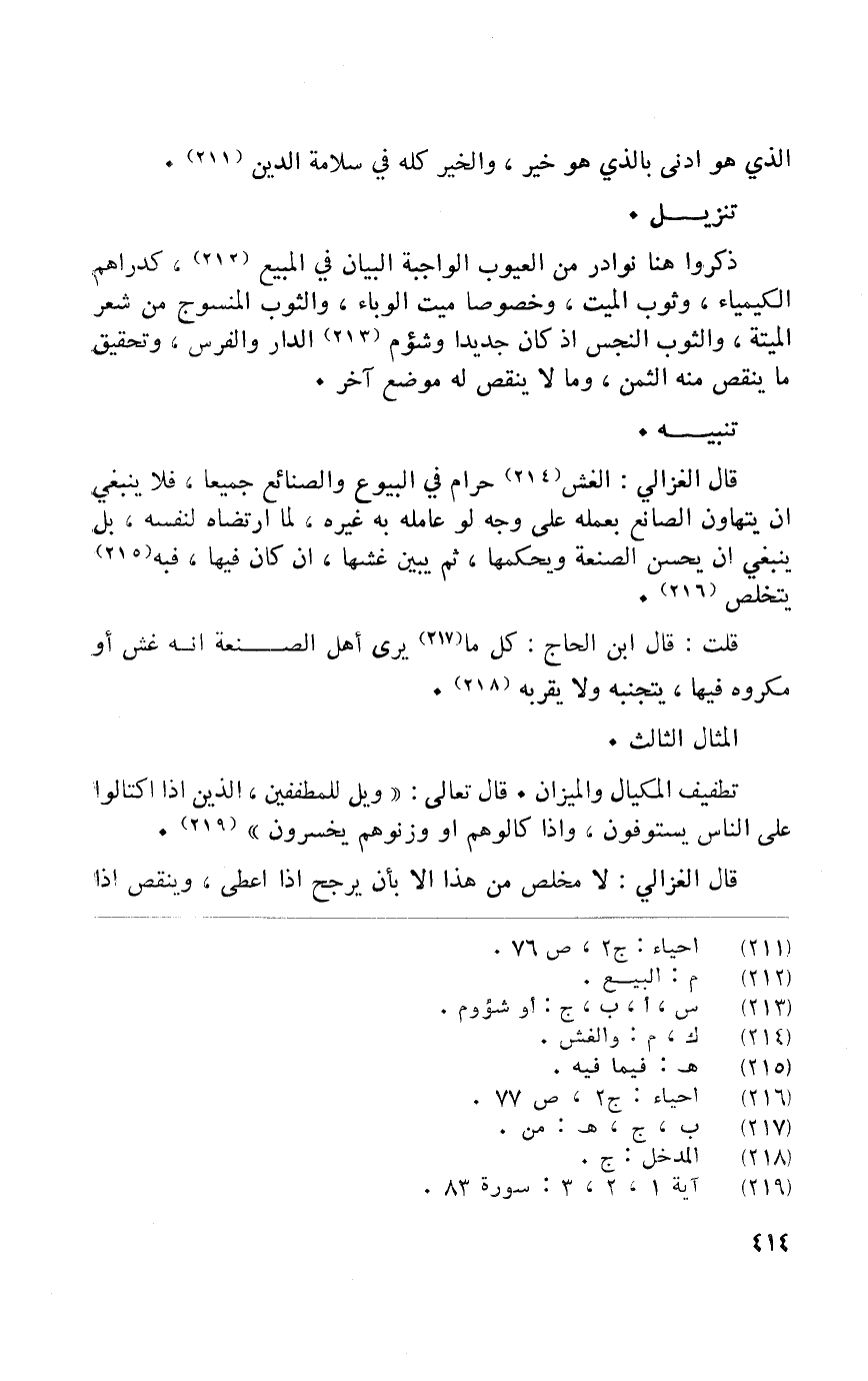 قَالَ الْغَزالِيّ الْغِشّ حرَام فِي الْبيُوع والصنائع جَمِيعًا لَا يَنْبَغِي أَن يتهاون الصَّانِع بِعَمَلِهِ على وَجه لَو عَامله بِهِ غَيره لما ارْتَضَاهُ لنَفسِهِ بل يَنْبَغِي أَن يحسن الصَّنْعَة ويحكمها ثمَّ يبين غشها أَن كَانَ فِيهَا فبه يتَخَلَّص