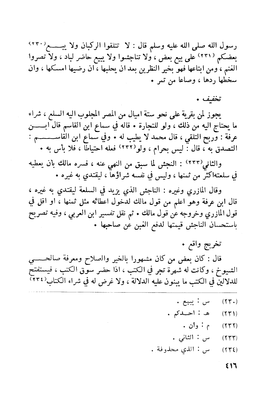 يجوز لمن بقرية على نَحْو سِتَّة اميال من الْمصر المجلوب اليه السّلع شِرَاء مَا يحْتَاج اليه من ذَلِك وَلَو للتِّجَارَة قَالَه فِي سَماع ابْن الْقَاسِم قَالَ ابْن عَرَفَة وَربح التلقي قَالَ مُحَمَّد لَا يطيب لَهُ وَفِي سَماع ابْن الْقَاسِم التَّصَدُّق بِهِ قَالَ لَيْسَ بِحرَام وَلَو فعله احْتِيَاطًا فَلَا بَأْس بِهِ