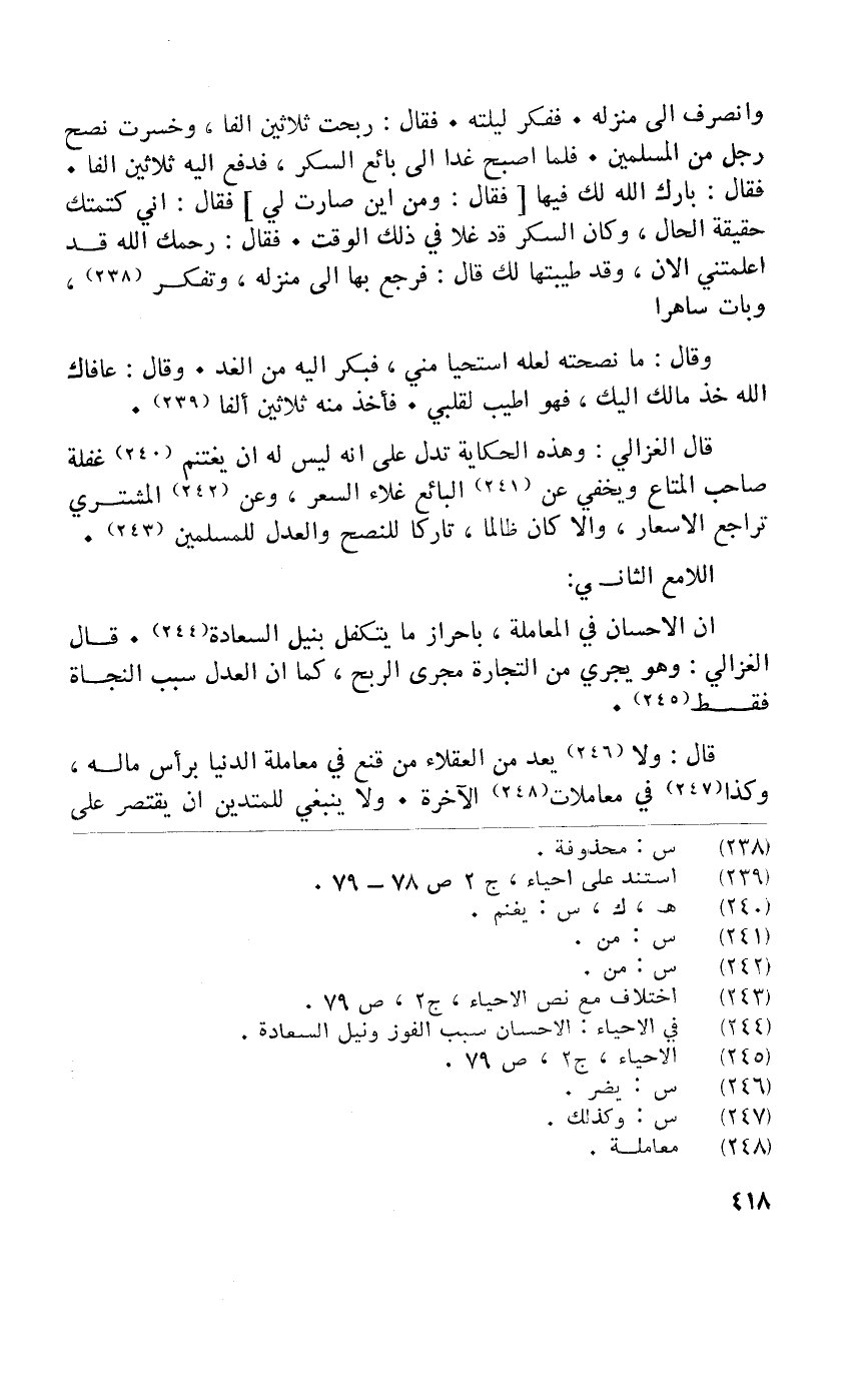 أَن الاحسان فِي الْمُعَامَلَة باحراز مَا يتكفل بنيل السَّعَادَة قَالَ الْغَزالِيّ وَهُوَ يجْرِي من التِّجَارَة مجْرى الرِّبْح كَمَا أَن الْعدْل سَبَب النجَاة فَقَط
