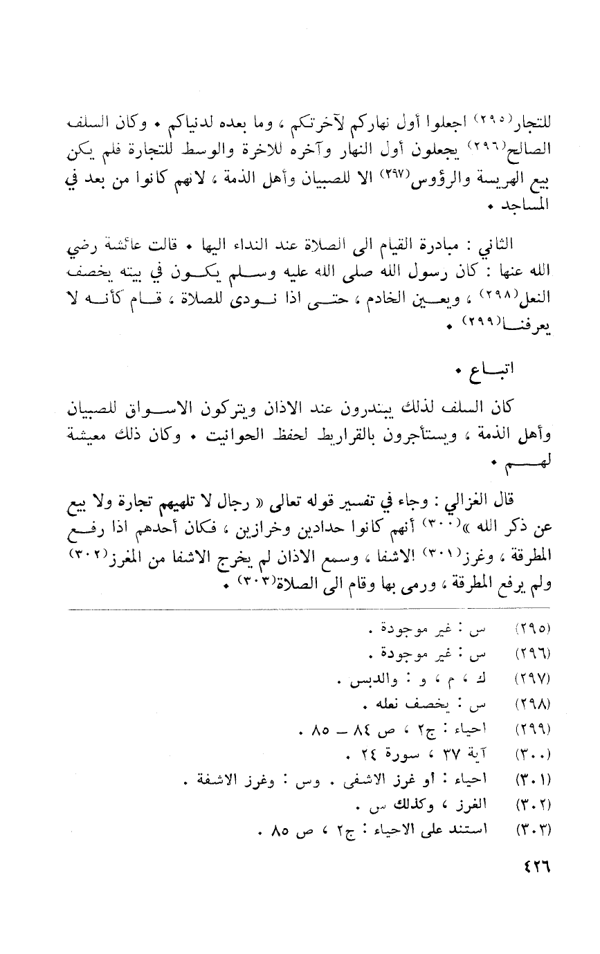 قَالَ الْغَزالِيّ وَجَاء فِي تَفْسِير قَوْله تَعَالَى {رجال لَا تُلْهِيهِمْ تِجَارَة وَلَا بيع عَن ذكر الله} انهم كَانُوا حدادين وخرازين فَكَانَ أحدهم إِذا رفع المطرقة وغرز الاشفا وَسمع الاذان لم يخرج الاشفا من المغرز وَلم يرفع المطرقة وَرمى بهَا وَقَامَ إِلَى الصَّلَاة