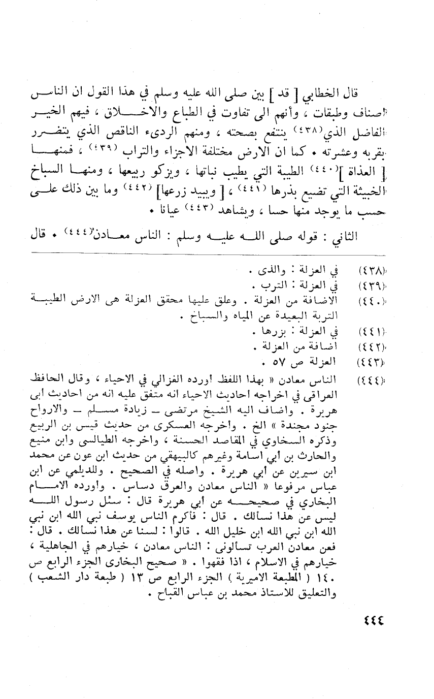 قَالَ الْخطابِيّ قد بَين صلى الله عَلَيْهِ وَسلم فِي هَذَا القَوْل أَن النَّاس اصناف وطبقات وانهم إِلَى تفَاوت فِي الطباع والاخلاق فيهم الْخَيْر الْفَاضِل الَّذِي ينْتَفع بِصِحَّتِهِ وَمِنْهُم الرَّدِيء النَّاقِص الَّذِي يتَضَرَّر بِقُرْبِهِ وعشرته كَمَا أَن الأَرْض مُخْتَلفَة الْأَجْزَاء وَالتُّرَاب فَمِنْهَا العذاة الطّيبَة الَّتِي يطيب نباتها ويزكو ربيعها وَمِنْهَا السباخ الخبيثة الَّتِي تضيع بذرها ويبيد زرعه وَمَا بَين ذَلِك حسب مَا يُوجد مِنْهَا حسا ويشاهد عيَانًا