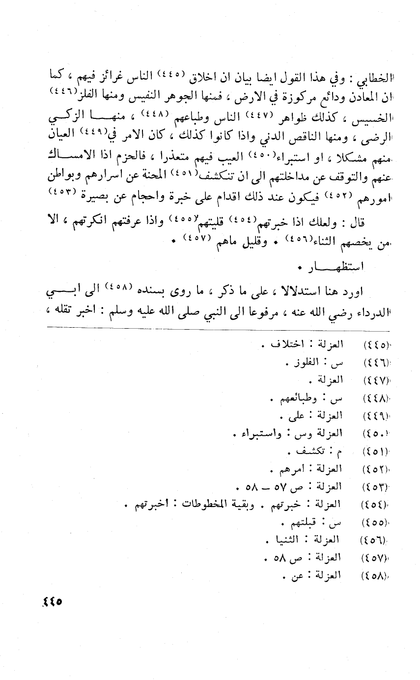 الْخطابِيّ وَفِي هَذَا القَوْل أَيْضا بَيَان أَن اخلاق النَّاس غرائز فيهم كَمَا أَن الْمَعَادِن ودائع مركوزة فِي الأَرْض فَمِنْهَا الْجَوْهَر النفيس وَمِنْهَا الفلز الخسيس كَذَلِك ظواهر النَّاس وطباعهم مِنْهَا الزكي الرضى وَمِنْهَا النَّاقِص الدني وَإِذا كَانُوا كَذَلِك كَانَ الْأَمر فِي العيان مِنْهُم مُشكلا اَوْ اسْتِبْرَاء الْعَيْب فيهم متعذرا فالحزم إِذا الامساك عَنْهَا والتوقف عَن مداخلتهم إِلَى أَن تنكشف المحنة أَن اسرارهم وبواطن امورهم فَيكون عِنْد ذَلِك اقدام على خبْرَة وماحجام عَن بَصِيرَة