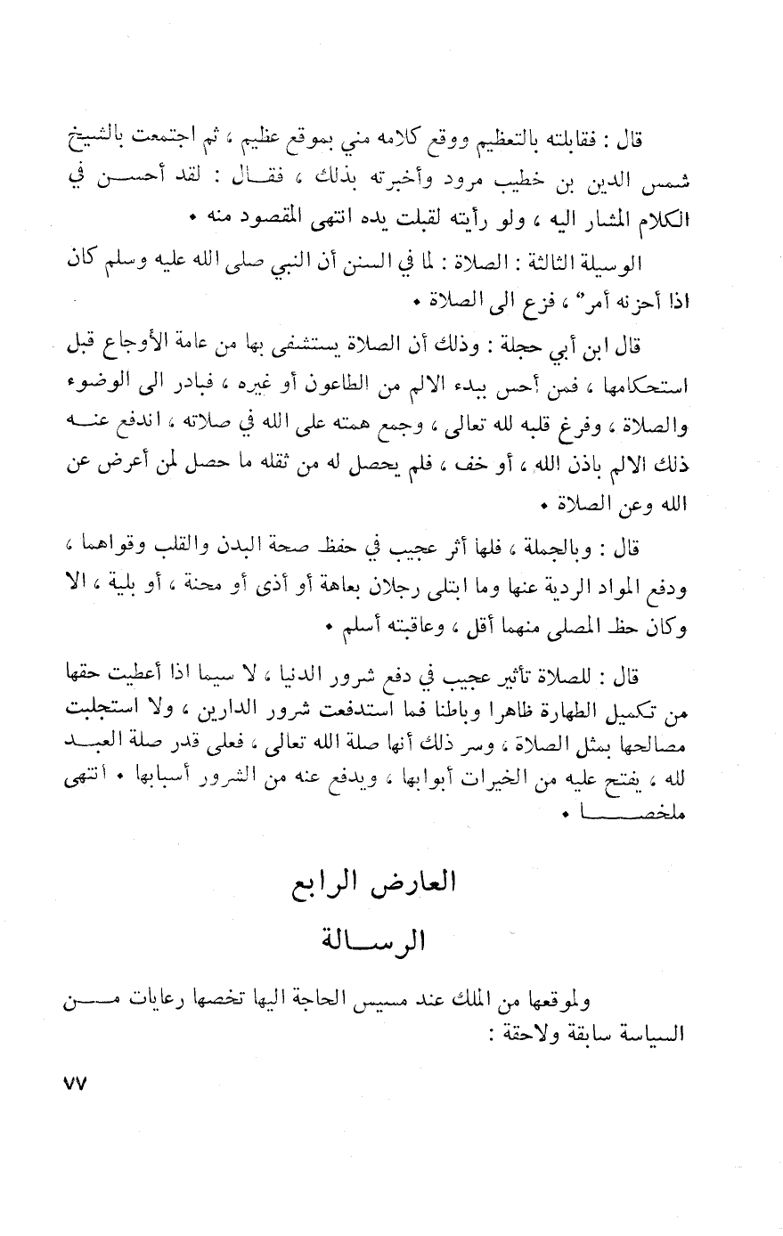 قَالَ للصَّلَاة تَأْثِير عَجِيب فِي دفع شرور الدُّنْيَا لَا سِيمَا إِذا أَعْطَيْت حَقّهَا من تَكْمِيل الطَّهَارَة ظَاهرا وَبَاطنا فَمَا استدفعت شرور الدَّاريْنِ وَلَا استجلبت مصالحها بِمثل الصَّلَاة وسر ذَلِك إِنَّهَا صلَة الله تَعَالَى فعلى قدر صلَة العَبْد لله يفتح عَلَيْهِ من الْخيرَات أَبْوَابهَا وَيدْفَع عَنهُ من الشرور أَسبَابهَا انْتهى مُلَخصا