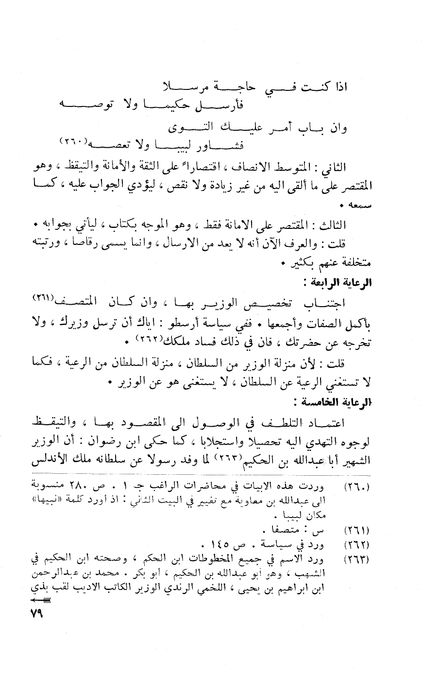 اعْتِمَاد التلطف فِي الْوُصُول إِلَى الْمَقْصُود بهَا والتيقظ لوجوه التهدي غليه تحصيلا واستجلابا كَمَا حكى ابْن رضوَان أَن الْوَزير الشهير أَبَا عبد الله بن الْحَكِيم لما وَفد رَسُولا عَن سُلْطَانه ملك الأندلس