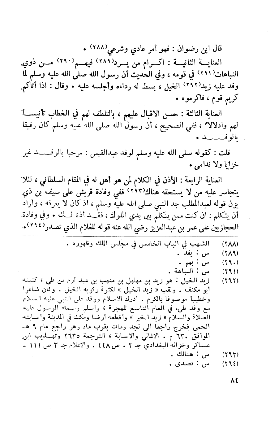 الْعِنَايَة الرَّابِعَة الْأذن فِي الْكَلَام لمن هُوَ أهل لَهُ فِي الْمقَام السلطاني لِئَلَّا يتجاسر عَلَيْهِ من لَا يسْتَحقّهُ هُنَاكَ فَفِي وفادة قُرَيْش على سيف بن ذِي يزن قَوْله لعبد الْمطلب جد النَّبِي صلى الله عَلَيْهِ وَسلم إِذْ كَانَ لَا يعرفهُ وَأَرَادَ أَن يتَكَلَّم إِن كنت مِمَّن يتَكَلَّم بَين يَدي الْمُلُوك فقد أذنا لَك وَفِي وفادة الْحِجَازِيِّينَ على عمر بن عبد الْعَزِيز رَضِي الله عَنهُ قَوْله للغلام الَّذِي تصدر