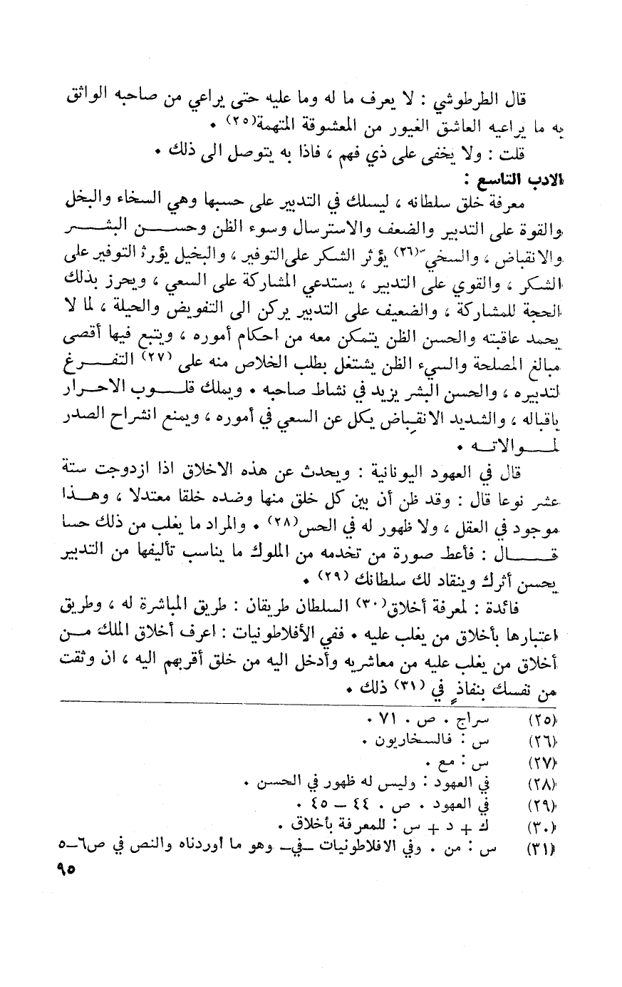 معرفَة خلق سُلْطَانه ليسلك فِي التَّدْبِير على حسبها وَهِي السخاء وَالْبخل وَالْقُوَّة على التَّدْبِير والضعف والاسترسال وَسُوء الظَّن وَحسن الْبشر والانقباض والسخي يُؤثر الشُّكْر على التوفير والبخيل يُؤثر التوفير على الشُّكْر وَالْقَوِي على التَّدْبِير يَسْتَدْعِي الْمُشَاركَة على السَّعْي ويحرز بذلك الْحجَّة للمشاركة والضعيف على التَّدْبِير يركن إِلَى التَّفْوِيض وَالْحِيلَة لما لَا يحمد عاقبته وَالْحسن الظَّن يتَمَكَّن مَعَه من إحكام أُمُوره وَيتبع فِيهَا أقْصَى مبالغ الْمصلحَة والسيئ الظَّن يشْتَغل بِطَلَب الْخَلَاص مِنْهُ على التفرغ لتدبيره وَالْحسن الْبشر يزِيد فِي نشاط صَاحبه وَيملك قُلُوب الْأَحْرَار بإقباله والشديد الانقباض يكل عَن السَّعْي فِي أُمُوره وَيمْنَع انْشِرَاح الصَّدْر لموالاته