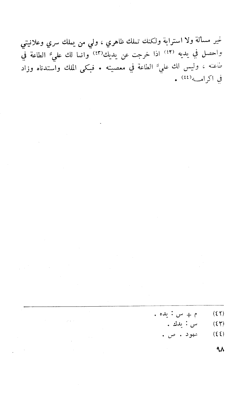 غير مَسْأَلَة وَلَا استرابة وَلَكِنَّك تملك ظاهري ولي من سري وعلانيتي واحصل فِي يَدَيْهِ إِذا خرجت عَن يَديك وَإِنَّمَا لَك عَليّ الطَّاعَة فِي طَاعَته وَلَيْسَ لَك عَليّ الطَّاعَة فِي مَعْصِيَته فَبكى الْملك واستدناه وَزَاد فِي إكرامه