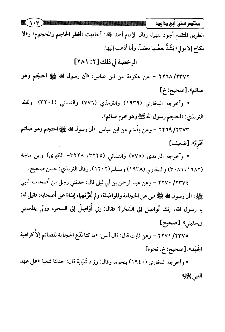 2375/ 2271 - وعن ثابت قال: قال أنس: "ما كنا نَدَع الحجامة للصائم إلا كراهية الجَهْد".hصحيح: خ، نحوه]