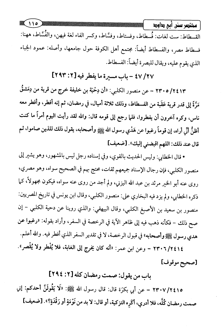 قال الخطابي: وليس الحديث بالقوي، وفي إسناده رجل ليس بالمشهور، وهو يشير إلى منصور الكلبي، فإن رجال الإسناد جميعهم ثقات، محتج بهم في الصحيح سواه، وهو مصري، روى عنه أبو الخير مرثد بن عبد اللَّه اليزني، ولم أجد من روى عنه سواه، فيكون مجهولًا، كما ذكره الخطابي، ولم يزد فيه البخاري على: منصور الكلبي، وقال ابن يونس في تاريخ المصريين: منصور بن سعيد بن الأصبغ الكلبي، وقال البيهقي: والذي روينا عن دحية الكلبي -إن صح ذلك- فكأنه ذهب فيه إلى ظاهر الآية في الرخصة في السفر، وأراد بقوله: "رغبوا عن هدي رسول -صلى اللَّه عليه وسلم- وأصحابه" في قبول الرخصة، لا في تقدير السفر الذي أفطر فيه. واللَّه أعلم.