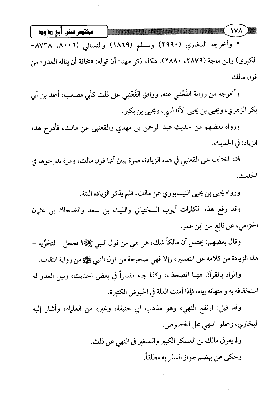 • وأخرجه البخاري (2990) ومسلم (1869) والنسائي (8006، 8738 - الكبرى) وابن ماجة (2879، 2880). هكذا ذكر ههنا: أن قوله: "مخافة أن يناله العدو" من قول مالك.