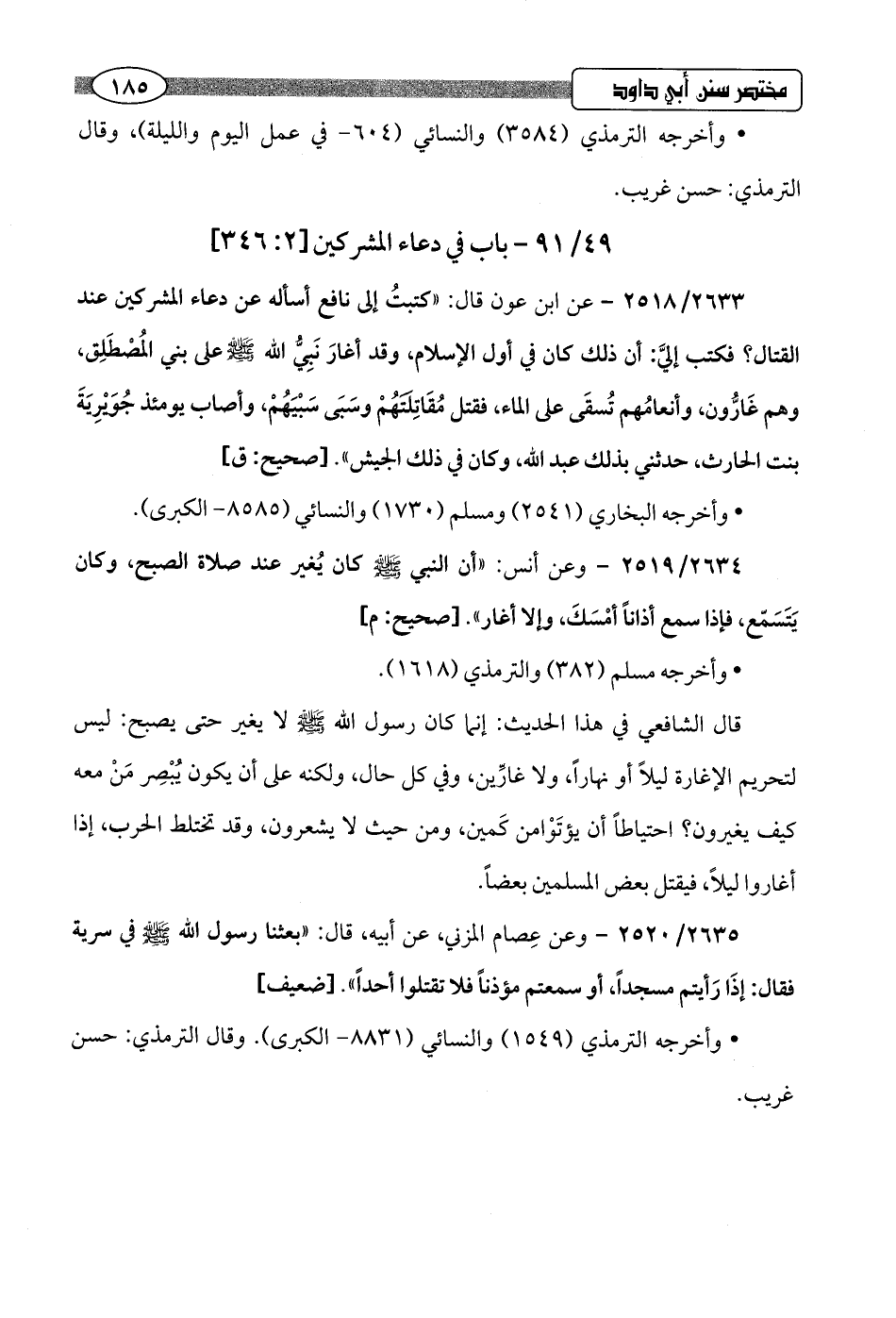2633/ 2518 - عن ابن عون قال: "كتبتُ إلى نافع أسأله عن دعاء المشركين عند القتال؟ فكتب إليَّ: أن ذلك كان في أول الإسلام، وقد أغارَ نَبِيُّ اللَّه -صلى اللَّه عليه وسلم- على بني المُصْطَلِق، وهم غَارُّون، وأنعامُهم تُسقَى على الماء، فقتل مُقَاتِلتَهُمْ وسَبَى سَبْيَهُمْ، وأصاب يومئذ جُوَيْرِيَةَ بنت الحارث، حدثني بذلك عبد اللَّه، وكان في ذلك الجيش".hصحيح: ق]