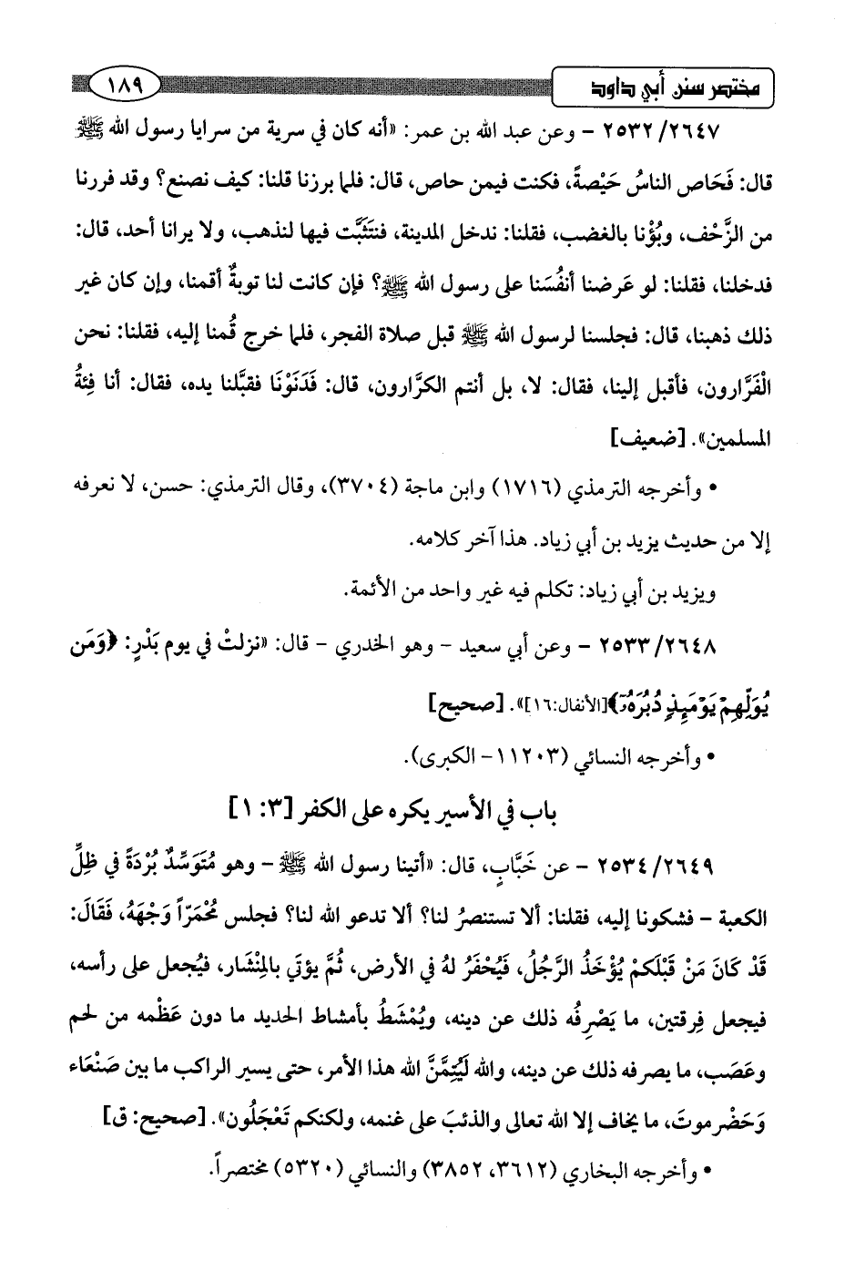 2648/ 2533 - وعن أبي سعيد -وهو الخدري- قال: "نزلتْ في يوم بَدْرٍ: {وَمَنْ يُوَلِّهِمْ يَوْمَئِذٍ دُبُرَهُ} [الأنفال: 16] ".hصحيح]