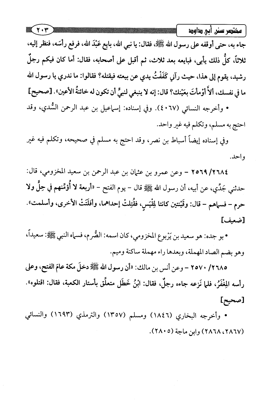 2684/ 2569 - وعن عمرو بن عثمان بن عبد الرحمن بن سعيد المخزومي، قال: حدثني جَدِّي، عن أبيه، أن رسول اللَّه -صلى اللَّه عليه وسلم- قال -يوم الفتح- "أربعة لا أُؤمِّنهم في حِلٍّ ولا حرم -فسماهم- قال: وقَيْنتين كانتا لمِقْيَسٍ، فقُتِلتْ إحداهما، وأفلتَتْ الأخرى، وأسلمت".hضعيف]