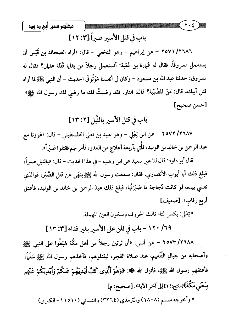 2687/ 2572 - عن ابن تِعْلِي -وهو عبيد بن تعلي الفلسطيني- قال: "غزونا مع عبد الرحمن بن خالد بن الوليد، فأُتي بأربعة أعلاج من العدو، فأمر بهم فقتلوا صَبْرًا".