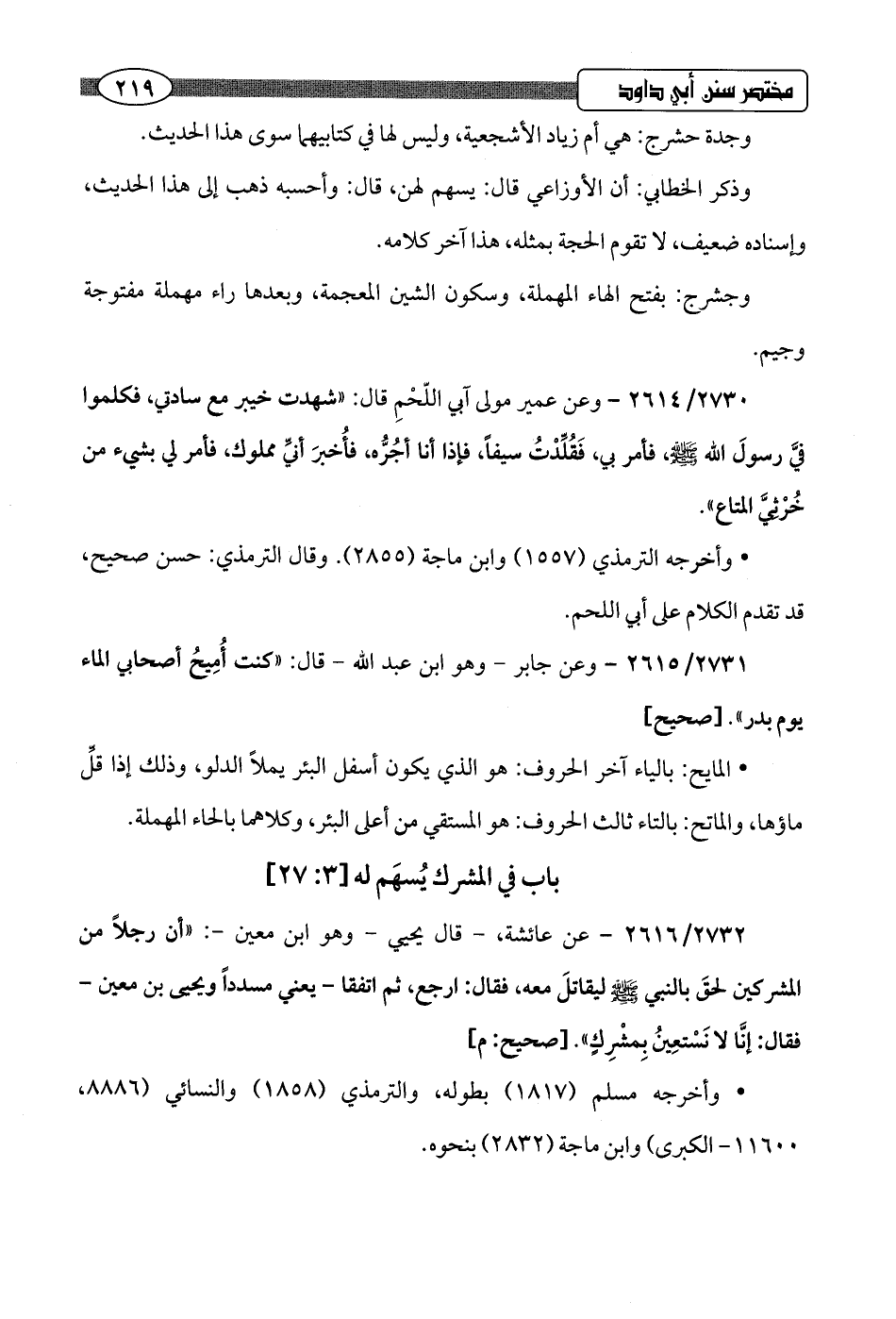 2730/ 2614 - وعن عمير مولى آبي اللّحْمِ قال: "شهدت خيبر مع سادتي، فكلموا فيَّ رسولَ اللَّه -صلى اللَّه عليه وسلم-، فأمر بي، فَقُلِّدْتُ سيفًا، فإذا أنا أجُرُّه، فأُخبرَ أنيِّ مملوك، فأمر لي بشيء من خُرْثيَّ المتاع".