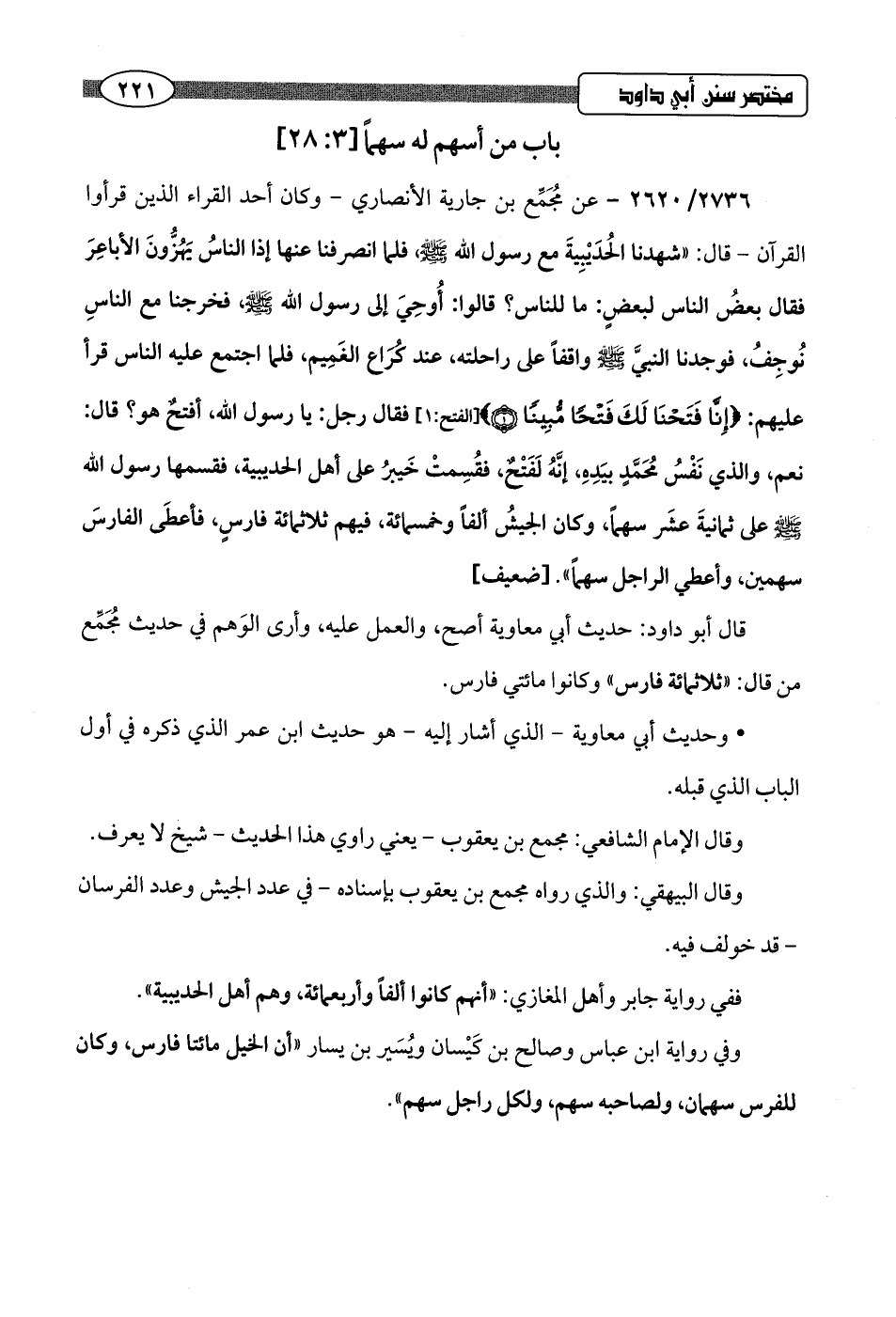 2736/ 2620 - عن مُجَمِّع بن جارية الأنصاري -وكان أحد القراء الذين قرأوا القرآن- قال: "شهدنا الحُدَيْبِيةَ مع رسول اللَّه -صلى اللَّه عليه وسلم- فلما انصرفنا عنها إذا الناسُ يَهُزُّونَ الأباعِرَ فقال بعضُ الناس لبعضٍ: ما للناس؟ قالوا: أُوحِيَ إلى رسول اللَّه -صلى اللَّه عليه وسلم-، فخرجنا مع الناسِ نُوجِفُ، فوجدنا النبيَّ -صلى اللَّه عليه وسلم- واقفًا على راحلته، عند كُراع الغَمِيم، فلما اجتمع عليه الناس قرأ عليهم: {إِنَّا فَتَحْنَا لَكَ فَتْحًا مُبِينًا (1)} [الفتح: 1] فقال رجل: يا رسول اللَّه، أفتحٌ هو؟ قال: نعم، والذي نَفْسُ مُحَمَّدٍ بيَدهِ، إنَّهُ لَفَتْحٌ، فقُسِمتْ خَيبرُ على أهل الحديبية، فقسمها رسول اللَّه -صلى اللَّه عليه وسلم- على ثمانيةَ عشَر سهمًا، وكان الجيشُ ألفًا وخمسمائة، فيهم ثلاثمائة فارسٍ، فأعطَى الفارسَ سهمين، وأعطي الراجل سهمًا".hضعيف]