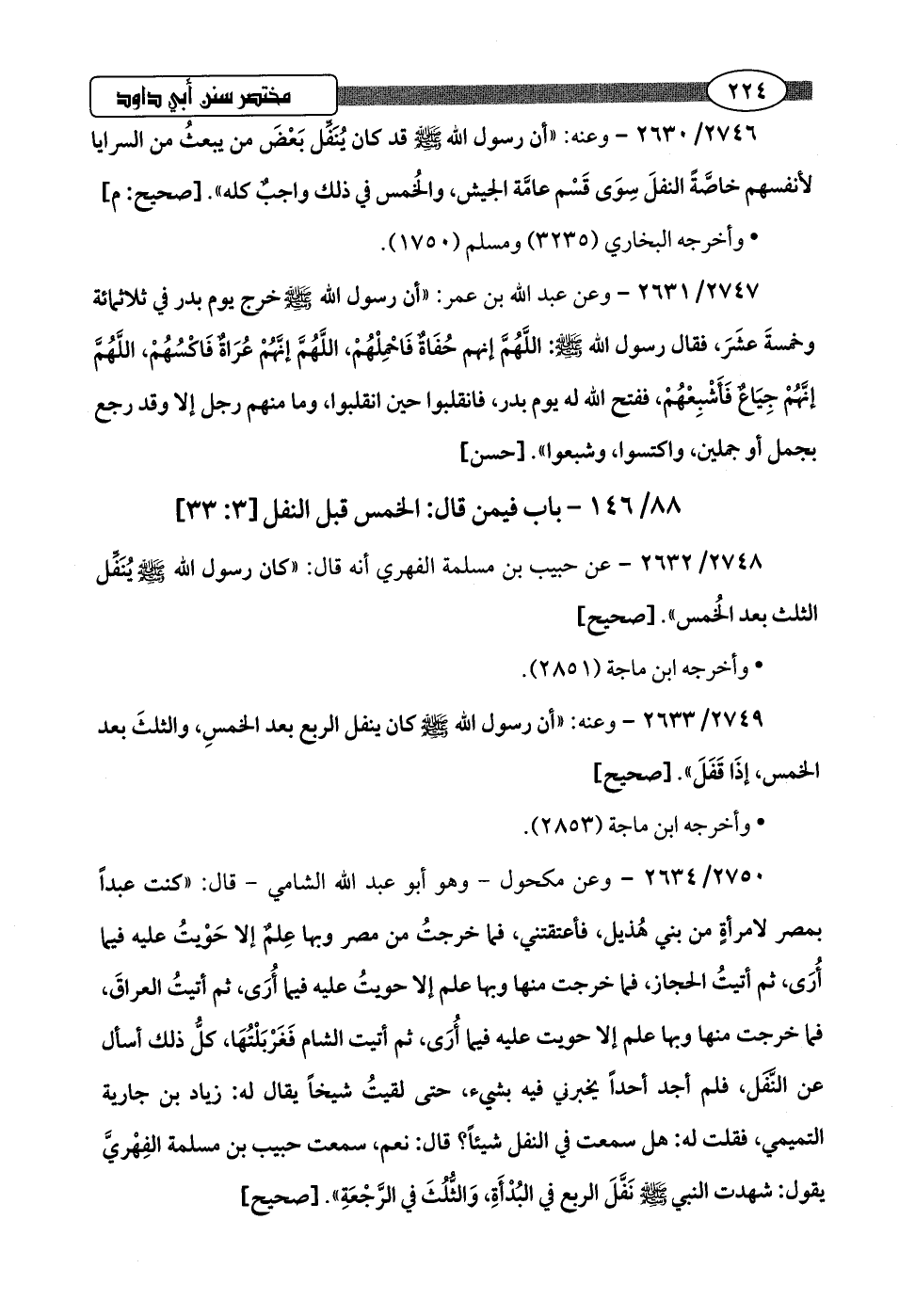 2750/ 2634 - وعن مكحول -وهو أبو عبد اللَّه الشامي- قال: "كنت عبدًا بمصر لامرأةٍ من بني هُذيل، فأعتقتني، فما خرجتُ من مصر وبها عِلمٌ إلا حَوْيتُ عليه فيما أُرَى، ثم أتيتُ الحجاز، فما خرجت منها وبها علم إلا حويتُ عليه فيما أُرَى، ثمَّ أتيتُ العراقَ، فما خرجت منها وبها علم إلا حويت عليه فيما أُرَى، ثمَّ أتيت الشام فَغَرْبَلْتُها، كلُّ ذلك أسأل عن النَّفَل، فلم أجد أحدًا يخبرني فيه بشيء، حتى لقيتُ شيخًا يقال له: زياد بن جارية التميمي، فقلت له: هل سمعت في النفل شيئًا؟ قال: نعم، سمعت حبيب بن مسلمة الفِهْريَّ يقول: شهدت النبي -صلى اللَّه عليه وسلم- نَفَّلَ الربع في البُدْأَةِ، والثُّلُثَ في الرَّجْعَةِ".hصحيح]