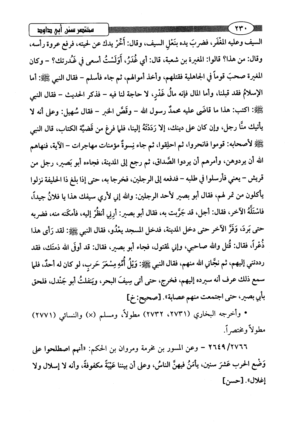 السيف وعليه المغْفَر، فضربَ يده بنَعْلِ السيف، وقال: أَخّرْ يدك عن لحيته، فرفع عروة رأسه، وقال: من هذا؟ قالوا: المغيرة بن شعبة، قال: أي غُدَرُ، أَوَلَسْتُ أسعى في غُدرتك؟ -وكان المغيرة صحبَ قومًا في الجاهلية فقتلهم، وأخذ أموالهم، ثم جاء فأسلم- فقال النبي -صلى اللَّه عليه وسلم-: أما الإِسلامُ فقد قبلنا، وأما المال فإنه مالُ غَدرٍ، لا حاجة لنا فيه -فذكر الحديث- فقال النبي -صلى اللَّه عليه وسلم-: اكتب: هذا ما قاضَى عليه محمدٌ رسول اللَّه -وقَصَّ الخبر- فقال سُهيل: وعلى أنه لا يأتيك منَّا رجل، وإن كان على دينك، إلا رَدَدْتَهُ إلينا، فلما فرغ من قَضيِّة الكتاب، قال النبي -صلى اللَّه عليه وسلم- لأصحابه: قوموا فانحروا، ثم احلِقوا، ثم جاء نِسوةٌ مؤمنات مهاجرات -الآية، فنهاهم اللَّه أن يردوهن، وأمرهم أن يردوا الصَّداق، ثم رجع إلى المدينة، فجاءه أبو بَصير، رجل من قريش -يعني فأرسلوا في طلبه- فدفعه إلى الرجلين، فخرجا به، حتى إذا بلغ ذا الحليفة نزلوا يأكلون من تمر لهم، فقال أبو بصير لأحد الرجلين: واللَّه إني لأري سيفك هذا يا فلانُ جيدًا، فاسْتَلَّهُ الآخر، فقال: أجل، قد جَرَّبت به، فقال أبو بصير: أرِنِي أنظُر إليه، فأمكَنه منه، فضربه حتى بَردَ، وَفَرَّ الآخر حتى دخل المدينة، فدخل المسجد يعْدُو، فقال النبي -صلى اللَّه عليه وسلم-: لقد رَأى هذا ذُعْرًا، فقال: قُتل واللَّه صاحبي، وإني لمقتول، فجاء أبو بصير، فقال: قد أوفَى اللَّه ذمتَك، فقد رددتني إليهم، ثم نجَّاني اللَّه منهم، فقال النبي -صلى اللَّه عليه وسلم-: وَيْلُ أُمِّهِ مِسْعَرَ حَربٍ، لو كان له أحدٌ، فلما سمع ذلك عرف أنه سيرده إليهم، فخرج، حتى أتى سِيفَ البحر، ويَنفلتُ أبو جَنْدل، فلحق بأبي بصير، حتى اجتمعت منهم عصابة".hصحيح: خ]