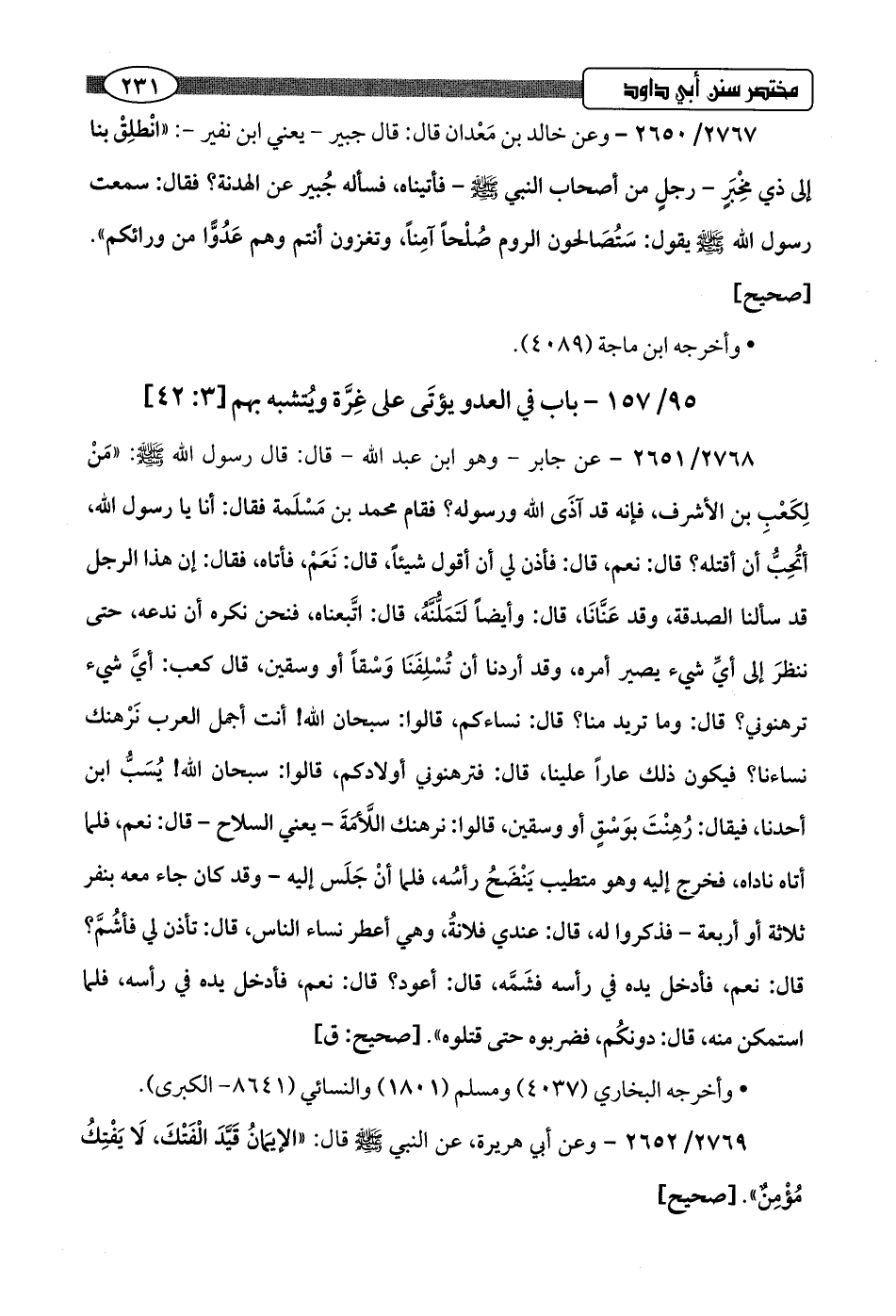 2767/ 2650 - وعن خالد بن مَعْدان قال: قال جبير -يعني ابن نفير-: "انْطلِقْ بنا إلى ذي مخبَرٍ -رجلٍ من أصحاب النبي -صلى اللَّه عليه وسلم- فأتيناه، فسأله جُبير عن الهدنة؟ فقال: سمعت رسول اللَّه -صلى اللَّه عليه وسلم- يقول: سَتُصَالحون الروم صُلْحًا آمِنًا، وتغزون أنتم وهم عَدُوًّا من ورائكم".hصحيح]