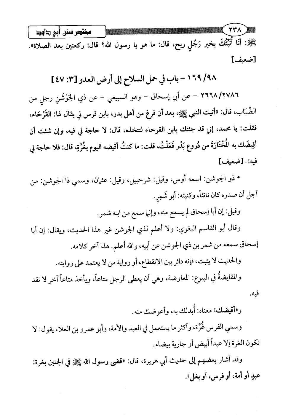 2786/ 2668 - عن أبي إسحاق -وهو السبيعي- عن ذي الجَوْشَنِ رجلٍ من الضِّباب، قال: "أتيت النبي -صلى اللَّه عليه وسلم-، بعد أن فرغ من أهل بدر، بابن فرس لي يقال لها: القَرْحَاء، فقلت: يا محمد، إني قد جئتك بابن القرحاء لتتخذه، قال: لا حاجة لي فيه، وإن شئت أن أقِيضَك به المُخْتارَةَ من دُروع بَدر فَعَلْتُ، قلت: ما كنتُ أقيضه اليوم بغُرَّةِ، قال: فلا حاجة لي فيه".hضعيف]