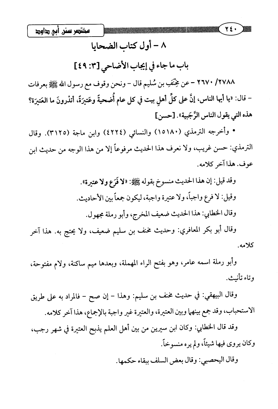 2788/ 2670 - عن مِخْنَفِ بن سُليم قال -ونحن وقوف مع رسول اللَّه -صلى اللَّه عليه وسلم- بعرفات- قال: "يا أيها الناس، إنَّ على كلِّ أهلِ بيت في كل عام أُضحيةً وعَتيرَةً، أتدرونَ ما العَتيرَة؟ هذه التي يقول الناس الرَّجَبية".hحسن]