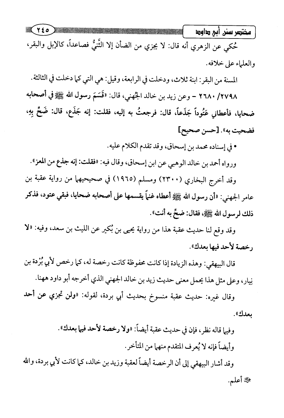 2798/ 2680 - وعن زيد بن خالد الجُهني، قال: "قَسَمَ رسول اللَّه -صلى اللَّه عليه وسلم- في أصحابه ضحايا، فأعطاني عَتُودًا جَذَعًا، قال: فرجعتُ به إليه، فقلت: إنه جَذَع، قال: ضَحِّ بِهِ، فضحيت به".hحسن صحيح]