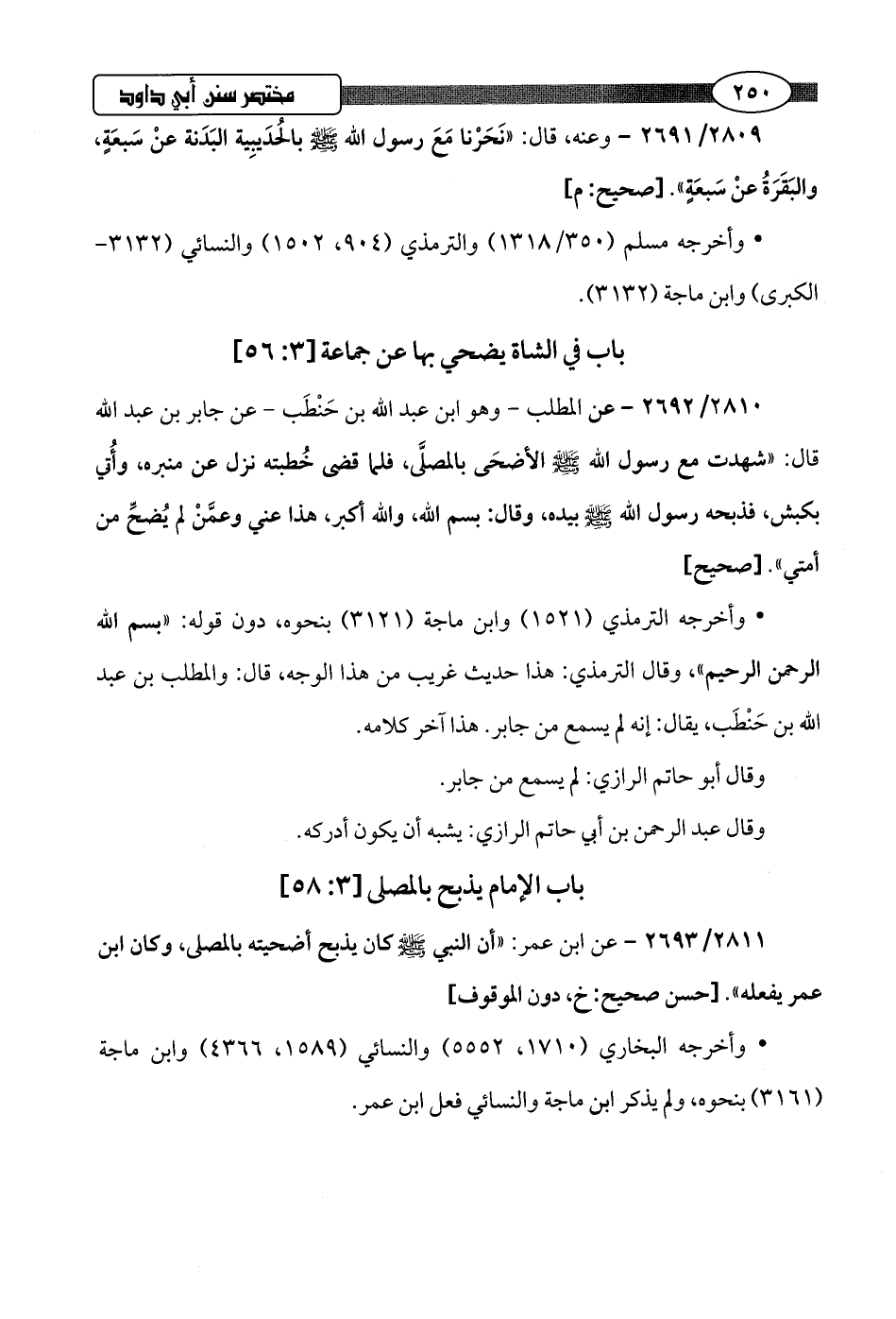 2810/ 2692 - عن المطلب -وهو ابن عبد اللَّه بن حَنْطَب- عن جابر بن عبد اللَّه قال: "شهدت مع رسول اللَّه -صلى اللَّه عليه وسلم- الأضحَى بالمصلَّى، فلما قضى خُطبته نزل عن منبره، وأُتي بكبش، فذبحه رسول اللَّه -صلى اللَّه عليه وسلم- بيده، وقال: بسم اللَّه، واللَّه أكبر، هذا عني وعمَّنْ لم يُضحِّ من أمتي".hصحيح]