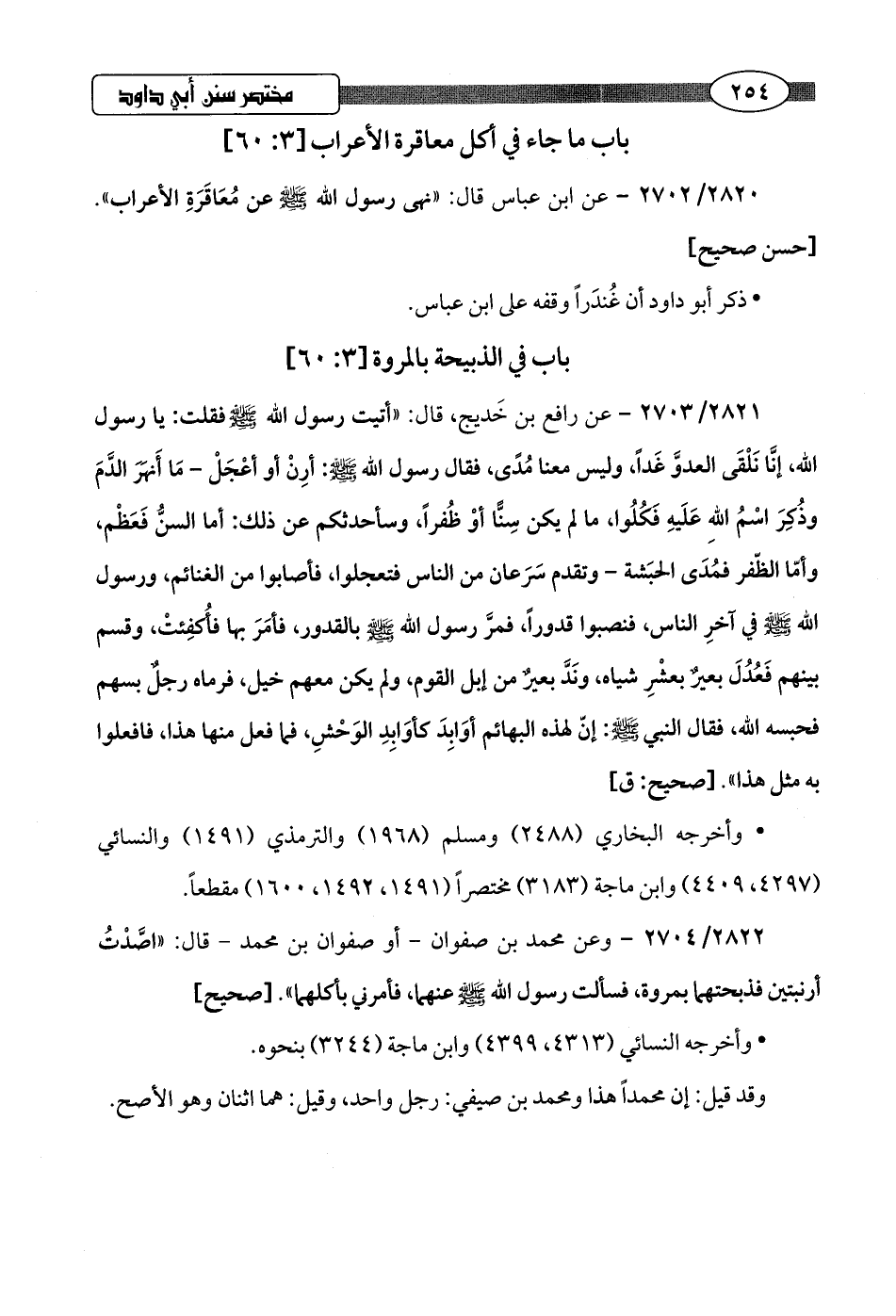 2822/ 2704 - وعن محمد بن صفوان -أو صفوان بن محمد- قال: "اصَّدْتُ أرنبتين فذبحتهما بمروة، فسألت رسول اللَّه -صلى اللَّه عليه وسلم- عنهما، فأمرني بأكلهما".hصحيح]