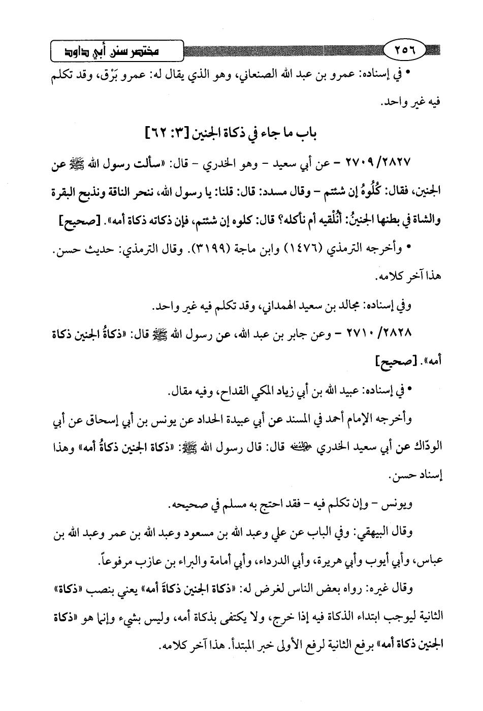 2828/ 2710 - وعن جابر بن عبد اللَّه، عن رسول اللَّه -صلى اللَّه عليه وسلم- قال: "ذكاةُ الجنين ذكاة أمه".hصحيح]