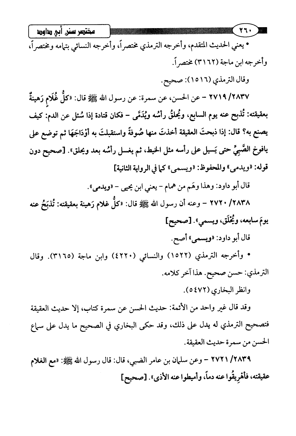 2837/ 2719 - عن الحسن، عن سمرة: عن رسول اللَّه -صلى اللَّه عليه وسلم-قال: "كلُّ غُلَامٍ رَهينةٌ بعقيقته: تُذبح عنه يوم السابع، ويُحلقُ رأسُه ويُدَمَّى -فكان قتادة إذا سُئل عن الدم: كيف يصنع به؟ قال: إذا ذبحتَ العقيقة أخذتَ منها صُوفةً واستقبلتَ به أوْدَاجَهَا ثم توضع على يافوخ الصَّبِيِّ حتى يَسيل على رأسه مثل الخيط، ثم يغسل رأسُه بعد ويحلق".hصحيح دون قوله: "ويدمى" والمحفوظ: "ويسمى" كما في الرواية الثانية]