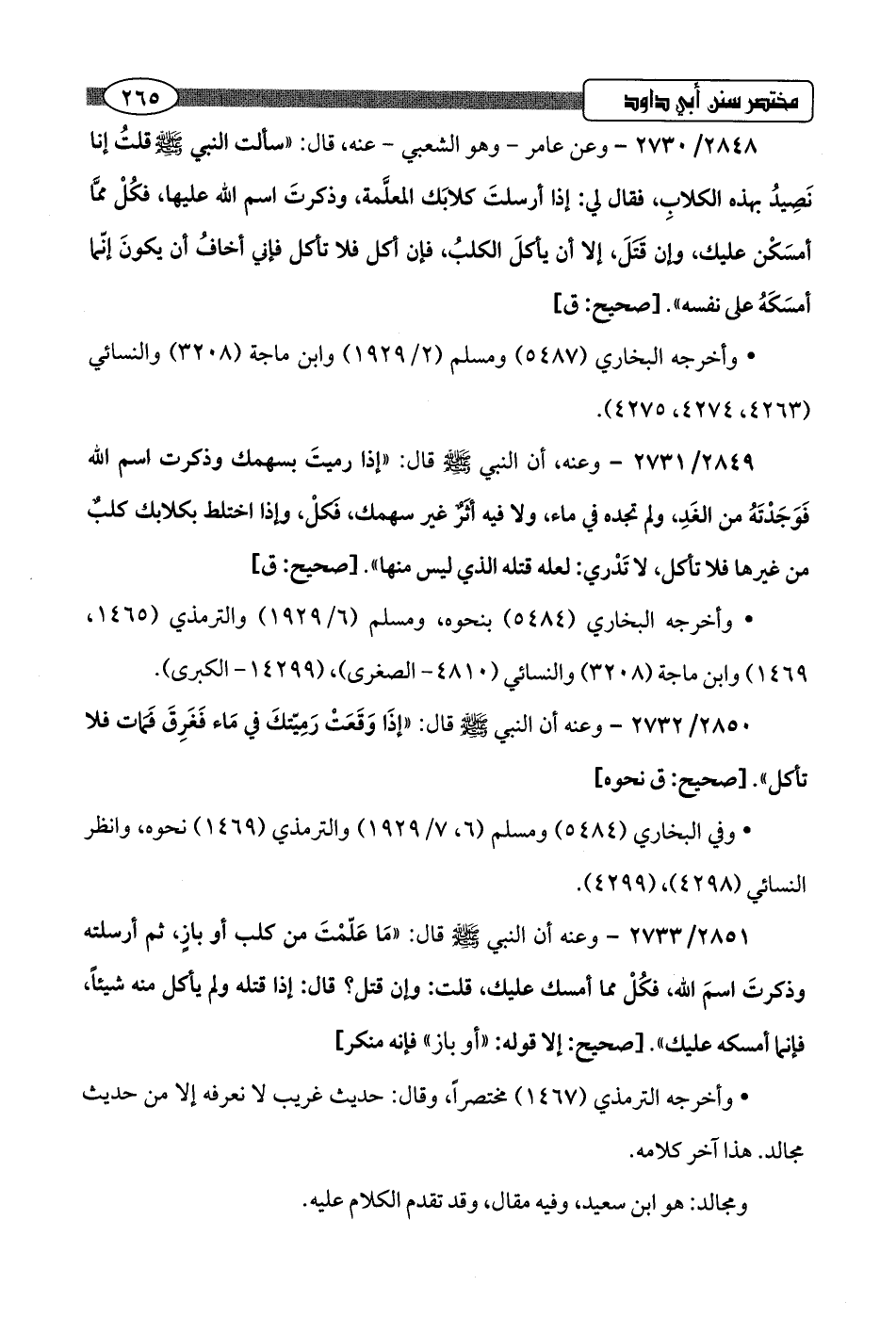 2848/ 2730 - وعن عامر -وهو الشعبي- عنه، قال: "سألت النبي -صلى اللَّه عليه وسلم- قلتُ إنا نَصِيدُ بهذه الكلابِ، فقال لي: إذا أرسلتَ كلابَك المعلَّمة، وذكرتَ اسم اللَّه عليها، فكُلْ ممَّا أمسَكْن عليك، وإن قَتَلَ، إلا أن يأكلَ الكلبُ، فإن أكل فلا تأكل فإني أخافُ أن يكونَ إنّما أمسَكَهُ على نفسه".hصحيح: ق]