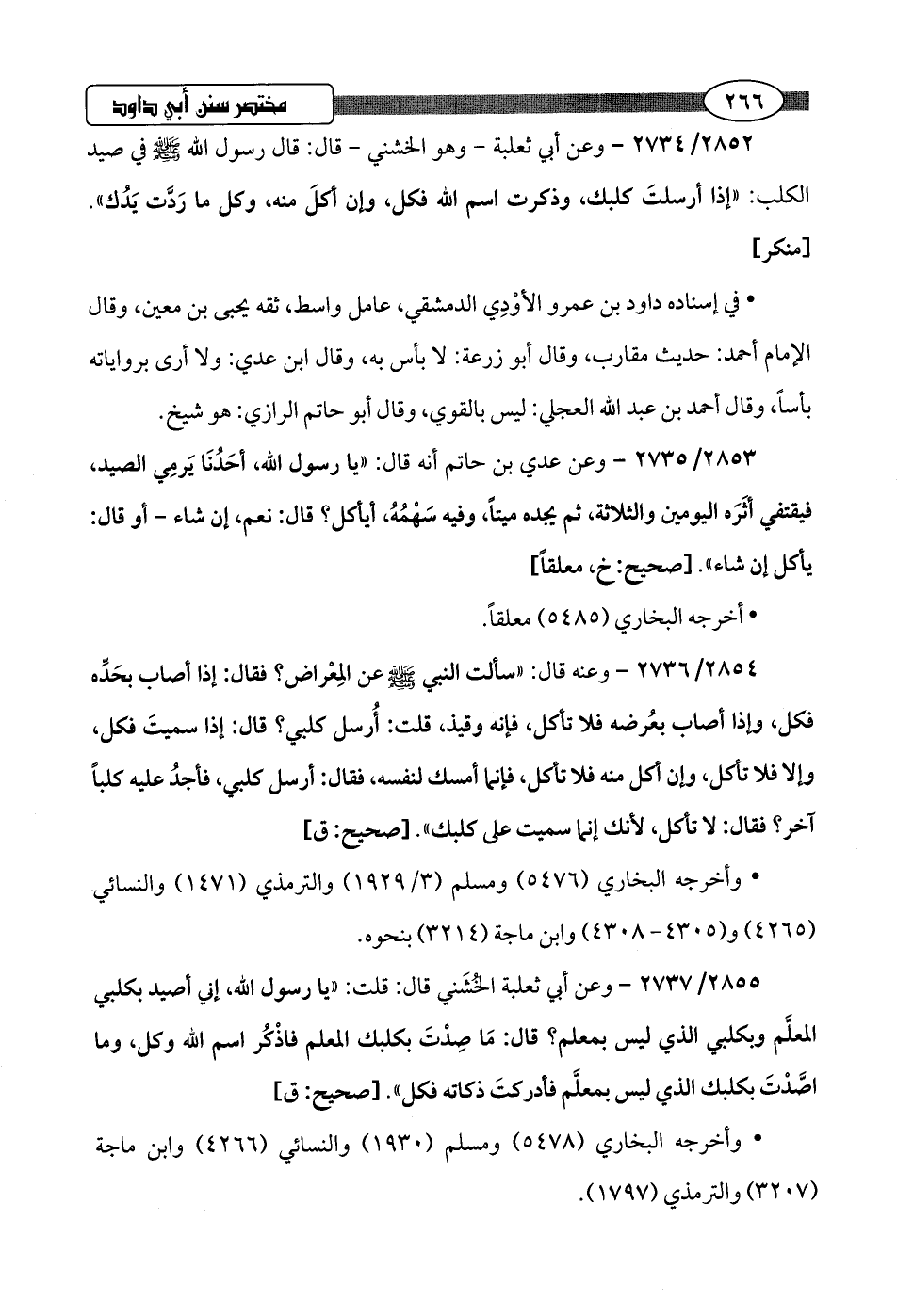 2852/ 2734 - وعن أبي ثعلبة -وهو الخشني- قال: قال رسول اللَّه -صلى اللَّه عليه وسلم- في صيد الكلب: "إذا أرسلتَ كلبك، وذكرت اسم اللَّه فكل، وإن أكلَ منه، وكل ما رَدَّت يَدُك".hمنكر]