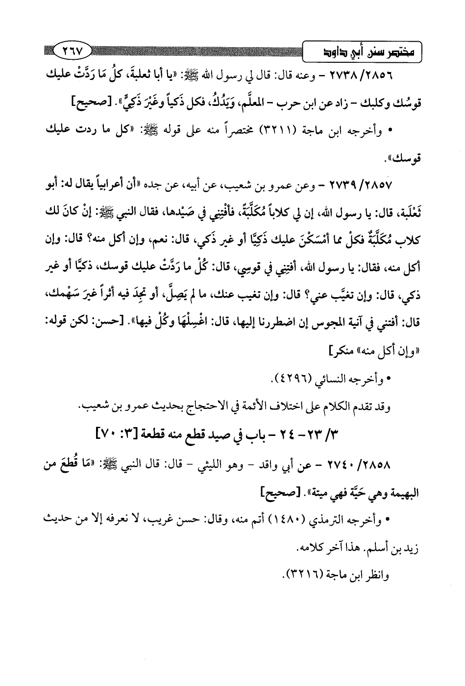 2857/ 2739 - وعن عمرو بن شعيب، عن أبيه، عن جده "أن أعرابيًا يقال له: أبو ثَعْلَبة، قال: يا رسول اللَّه، إن لي كلابًا مُكَلَّبَةً، فأفْتِنِي في صَيْدها، فقال النبي -صلى اللَّه عليه وسلم-: إنْ كانَ لك كلاب مُكَلَّبَةٌ فكل مما أمْسَكْنَ عليك ذَكِيَّا أو غير ذَكي، قال: نعم، وإن أكل منه؟ قال: وإن أكل منه، فقال: يا رسول اللَّه، أفتِنِي في قوسِي، قال: كُلْ ما رَدَّت عليك قوسك، ذكيَّا أو غير ذكي، قال: وإن تغيَّب عني؟ قال: وإن تغيب عنك، ما لم يَصِلَّ، أو تجِدَ فيه أثرًا غيرَ سَهْمك، قال: أفتني في آنية المجوس إن اضطررنا إليها، قال: اغْسِلْهَا وكُلْ فيها".hحسن: لكن قوله: "وإن أكل منه" منكر]