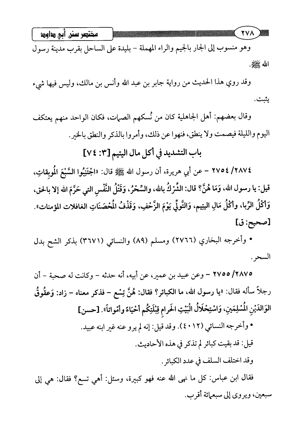 2874/ 2754 - عن أبي هريرة، أن رسول اللَّه -صلى اللَّه عليه وسلم- قال: "اجْتَنِبُوا السَّبْعَ المُوبِقاتِ، قيل: يا رسول اللَّه، وَمَا هُنَّ؟ قال: الشِّرْكُ باللَّه، والسِّحْرُ، وَقَتْلُ النَّفْسِ التي حَرَّمَ اللَّه إلا بالحق، وَأكْلُ الرِّبا، وكْلُ مَالِ اليتِيم، وَالتَّولِّي يَوْمَ الزَّحْفِ، وَقَذْفُ المُحْصَنَاتِ الغافلات المؤمنات".hصحيح: ق]