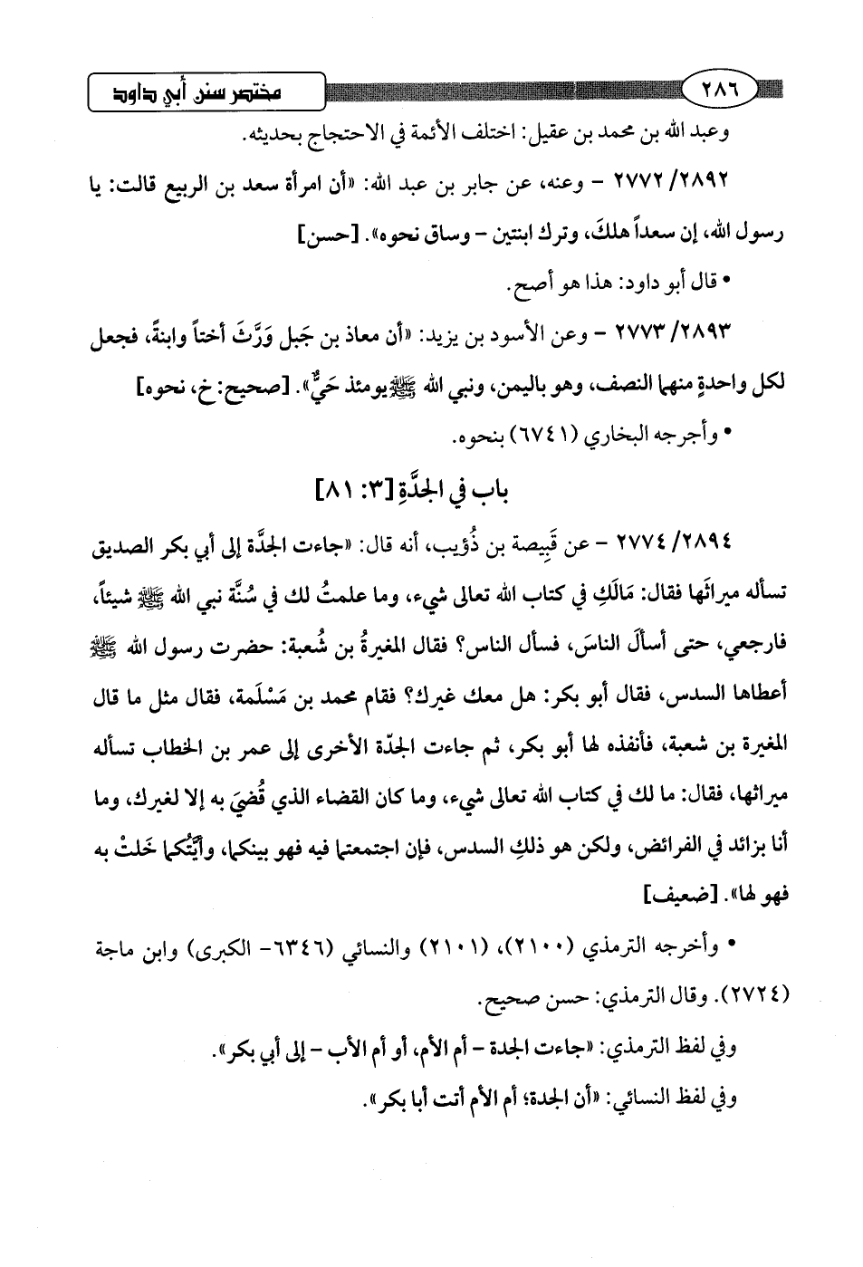 2894/ 2774 - عن قَبِيصة بن ذُؤيب، أنه قال: "جاءت الجدَّة إلى أبي بكر الصديق تسأله ميراثَها فقال: مَالَكِ في كتاب اللَّه تعالى شيء، وما علمتُ لك في سُنَّة نبي اللَّه -صلى اللَّه عليه وسلم- شيئًا، فارجعي، حتى أسألَ الناسَ، فسأل الناس؟ فقال المغيرةُ بن شُعبة: حضرت رسول اللَّه -صلى اللَّه عليه وسلم- أعطاها السدس، فقال أبو بكر: هل معك غيرك؟ فقام محمد بن مَسْلَمة، فقال مثل ما قال المغيرة بن شعبة، فأنفذه لها أبو بكر، ثم جاءت الجدّة الأخرى إلى عمر بن الخطاب تسأله ميراثها، فقال: ما لك في كتاب اللَّه تعالى شيء، وما كان القضاء الذي قُضيَ به إلا لغيرك، وما أنا بزائد في الفرائض، ولكن هو ذلكِ السدس، فإن اجتمعتما فيه فهو بينكما، وأيَّتُكما خَلتْ به فهو لها".hضعيف]