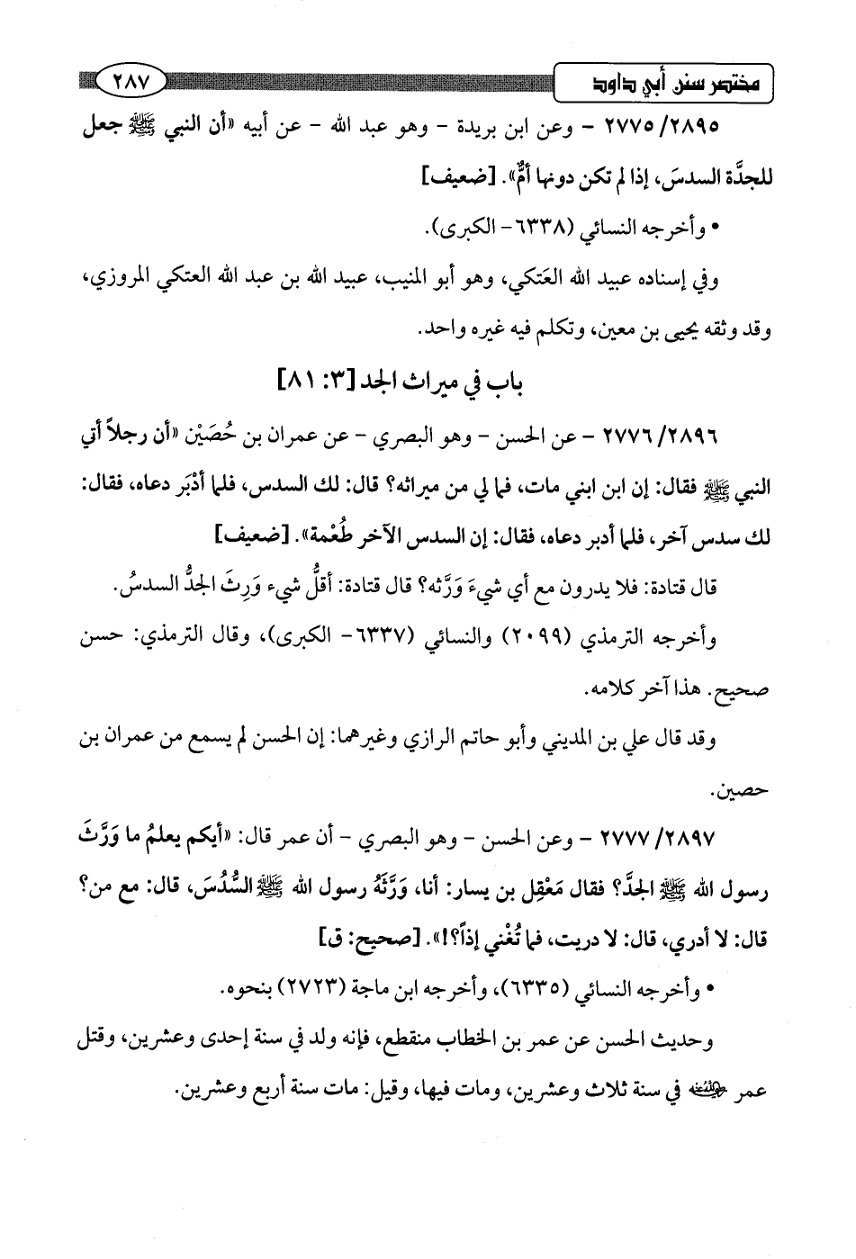 2896/ 2776 - عن الحسن -وهو البصري- عن عمران بن حُصَيْن "أن رجلًا أتي النبي -صلى اللَّه عليه وسلم- فقال: إن ابن ابني مات، فما لي من ميراثه؟ قال: لك السدس، فلما أدْبَر دعاه، فقال: لك سدس آخر، فلما أدبر دعاه، فقال: إن السدس الآخر طُعْمة".hضعيف]