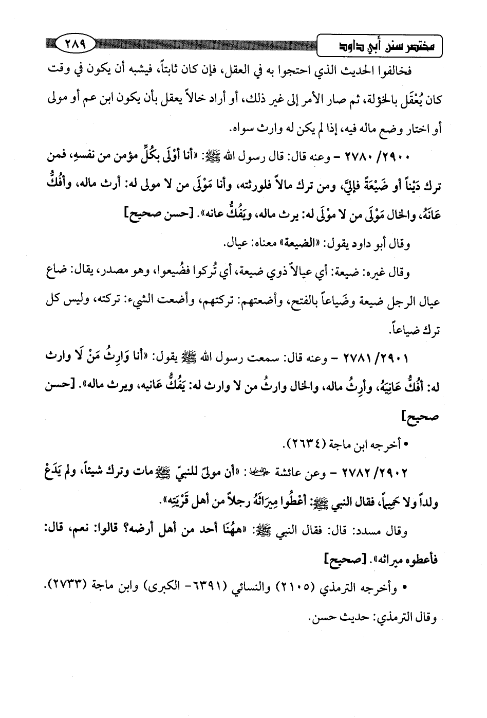 2900/ 2780 - وعنه قال: قال رسول اللَّه -صلى اللَّه عليه وسلم-: "أنا أوْلَى بكُلِّ مؤمن من نفسهِ، فمن ترك دَيْنًا أو ضَيْعَةً فإليَّ، ومن ترك مالًا فلورثته، وأنا مَوْلَى من لا مولى له: أرث ماله، وأفُكُّ عَانَهُ، والخال مَوْلَى من لا موْلَى له: يرث ماله، ويَفُكُّ عانه".hحسن صحيح]