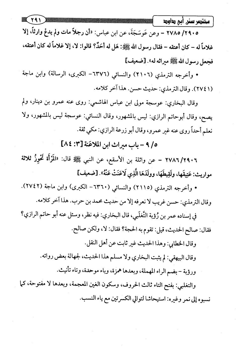 2906/ 2786 - عن واثلة بن الأسقع، عن النبي -صلى اللَّه عليه وسلم- قال: "المَرْأَة تَحْوِزُ ثلاثة مواريث: عَتِيقَها، ولَقِيطَهَا، وولَدَهَا الَّذِي لَاعَنَتْ عَنْهُ".hضعيف]