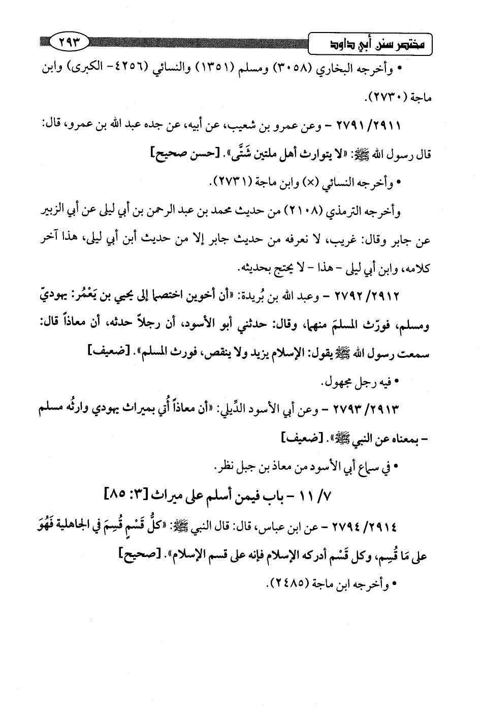 2912/ 2792 - وعبد اللَّه بن بُريدة: "أن أخوين اختصما إلى يحيى بن يَعْمُر: يهوديّ ومسلم، فورّث المسلمَ منهما، وقال: حدثني أبو الأسود، أن رجلًا حدثه، أن معاذًا قال: سمعت رسول اللَّه -صلى اللَّه عليه وسلم- يقول: الإسلام يزيد ولا ينقص، فورث المسلم".hضعيف]