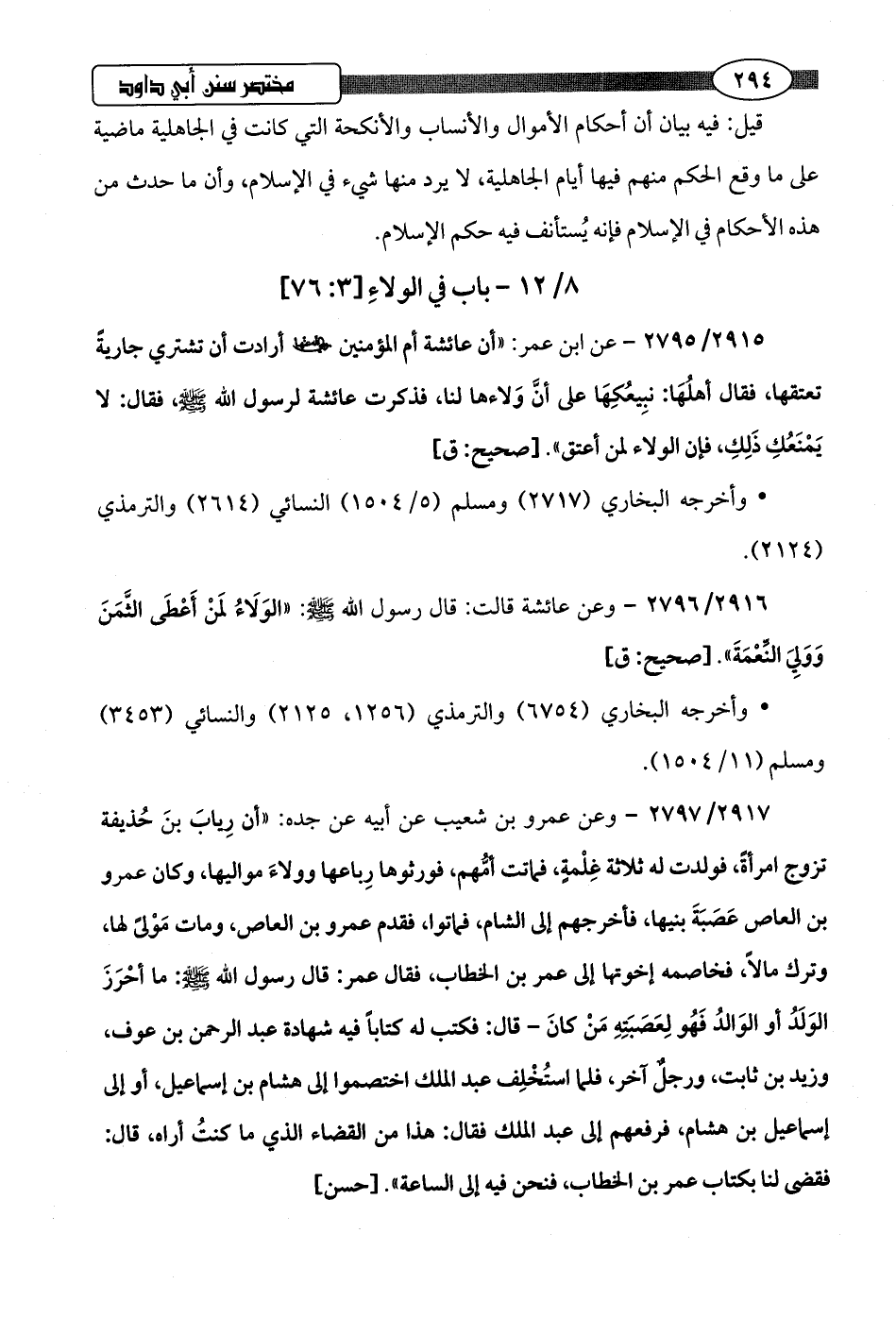 2915/ 2795 - عن ابن عمر: "أن عائشة أم المؤمنين -رضي اللَّه عنها- أرادت أن تشتري جاريةً تعتقها، فقال أهلُهَا: نبِيعُكِهَا على أنَّ وَلاءها لنا، فذكرت عائشة لرسول اللَّه -صلى اللَّه عليه وسلم-، فقال: لا يَمْنَعُكِ ذَلِكِ، فإن الولاء لمن أعتق".hصحيح: ق]